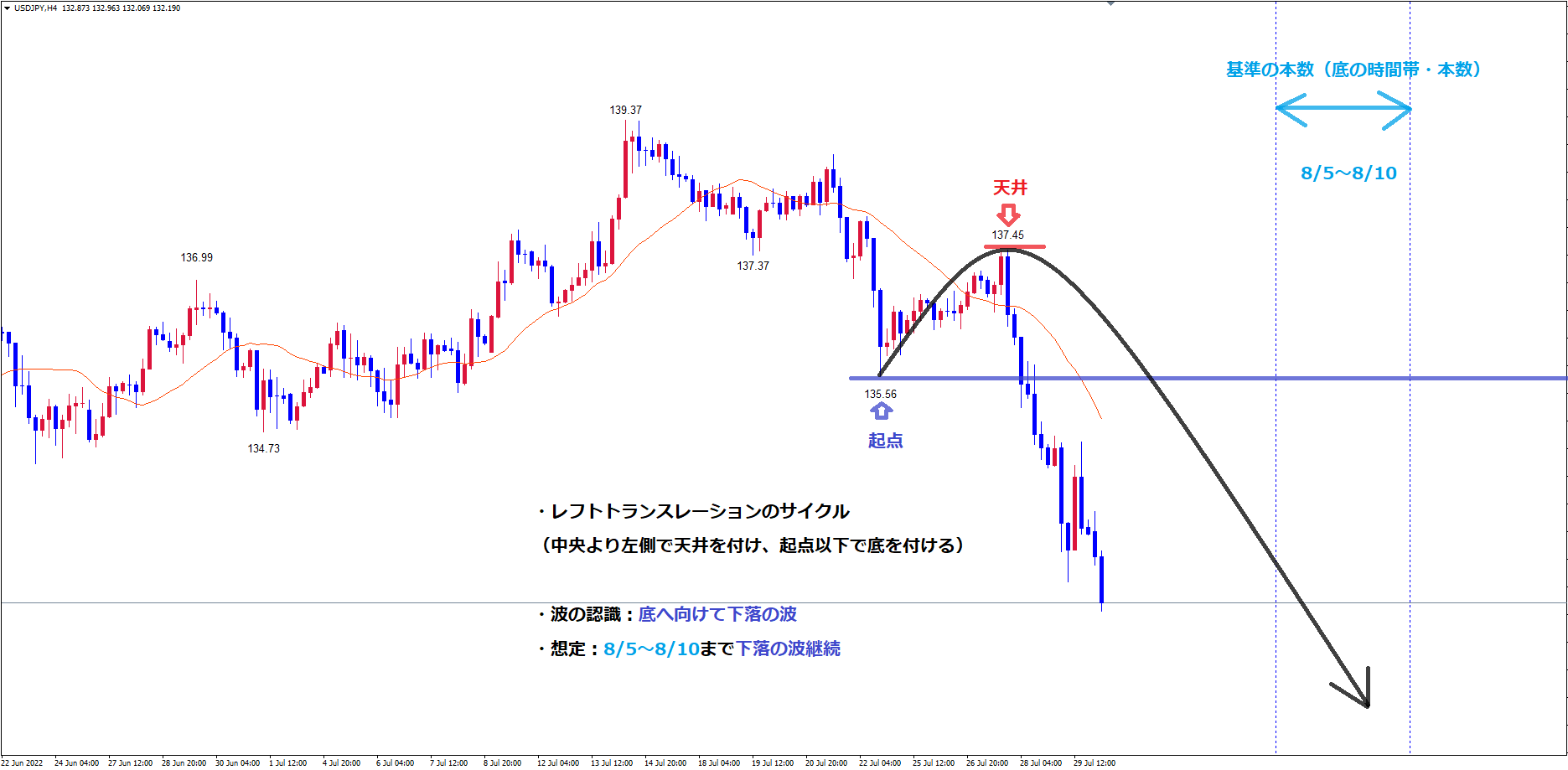 そして、既に起点の青のラインを割れている事でレフトトランスレーションの確定中で、現在は天井の赤のライン137.45から底へ向けて下落中です。