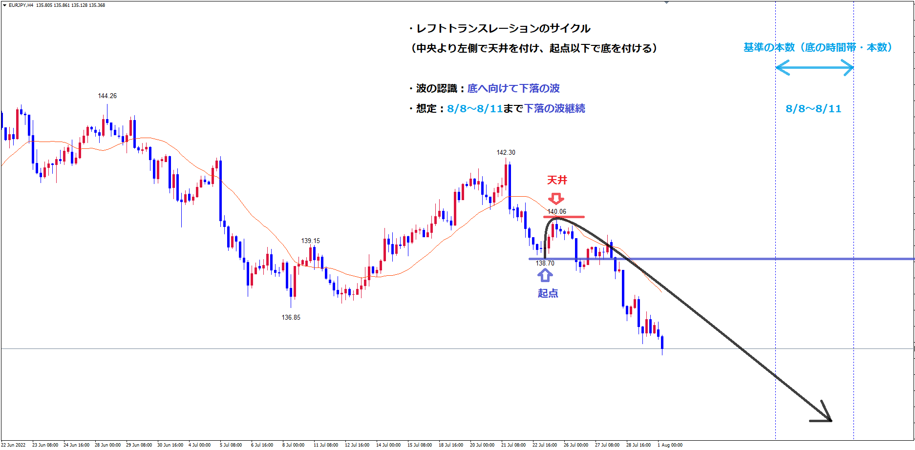 そして、既に起点の青のラインを割れている事でレフトトランスレーションの確定中で、現在は天井の赤のライン140.06から底へ向けて下落中です。