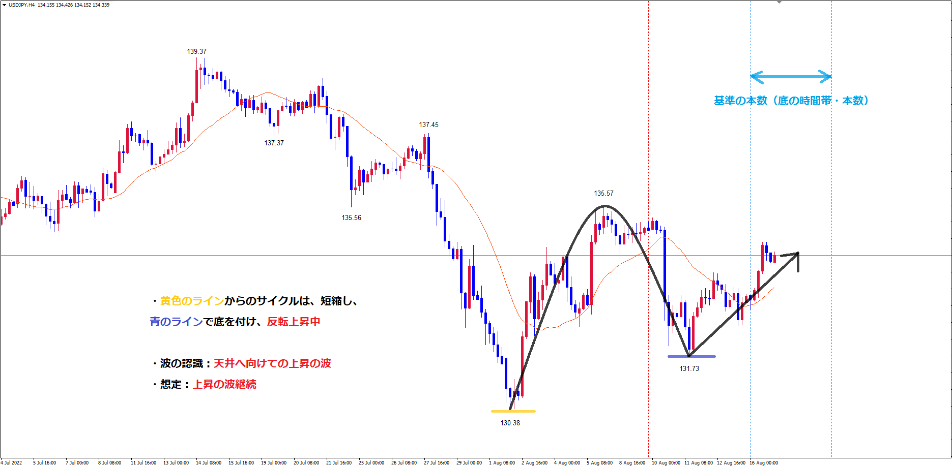 先程解説した様に、黄色のラインからの4時間サイクルは、少しイレギュラーな形ではありますが、