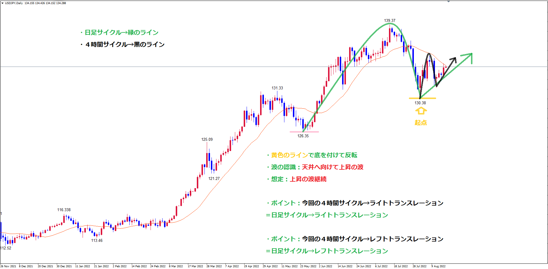 ・今回の青のラインからの4時間サイクル→ライトトランスレーション = 日足サイクル→ライトトランスレーション