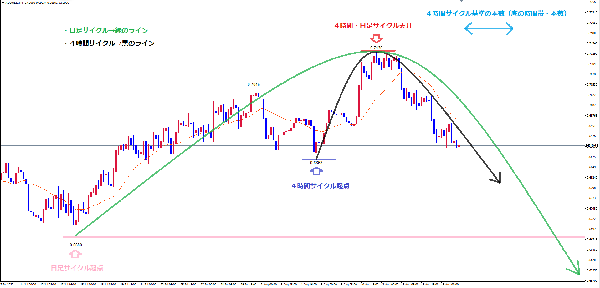 豪ドルドル4時間サイクルは、起点の青のライン0.6868から現在58本です。