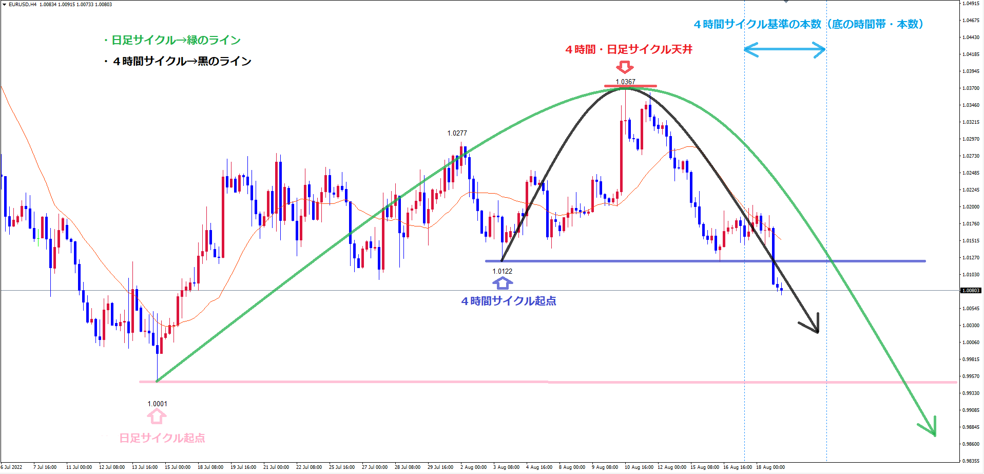 現在は天井赤のライン1.0367から底へ向けて下落の波という認識です。(基準の本数(底の時間帯・本数)内)