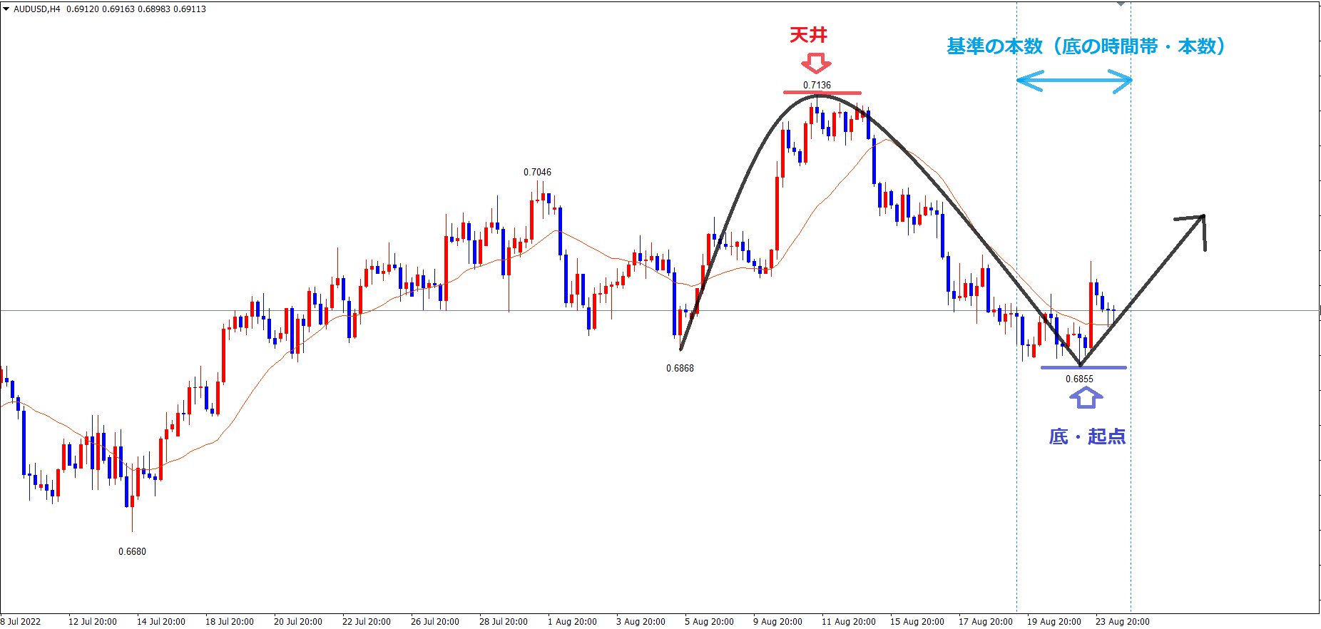豪ドルドル4時間サイクルは、これまで見てきた0.6868からのサイクルが71本目に付けた昨日の安値青のライン0.6855で底を付けて反転と見て、