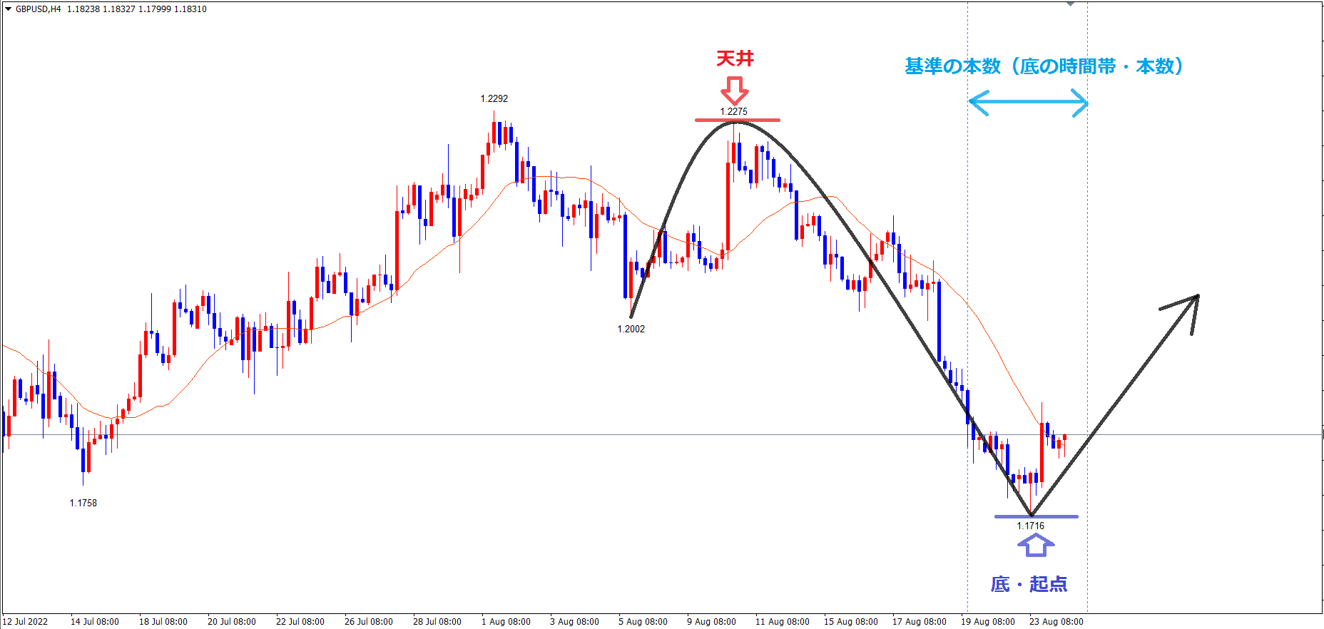 つまり、中央より左側で天井を付けて、起点以下で底を付けるサイクルになるという事で