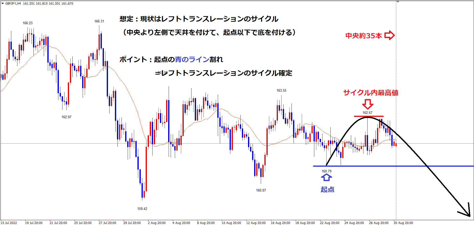 また、今後起点の青のラインを割れればレフトトランスレーションの4時間サイクル確定
