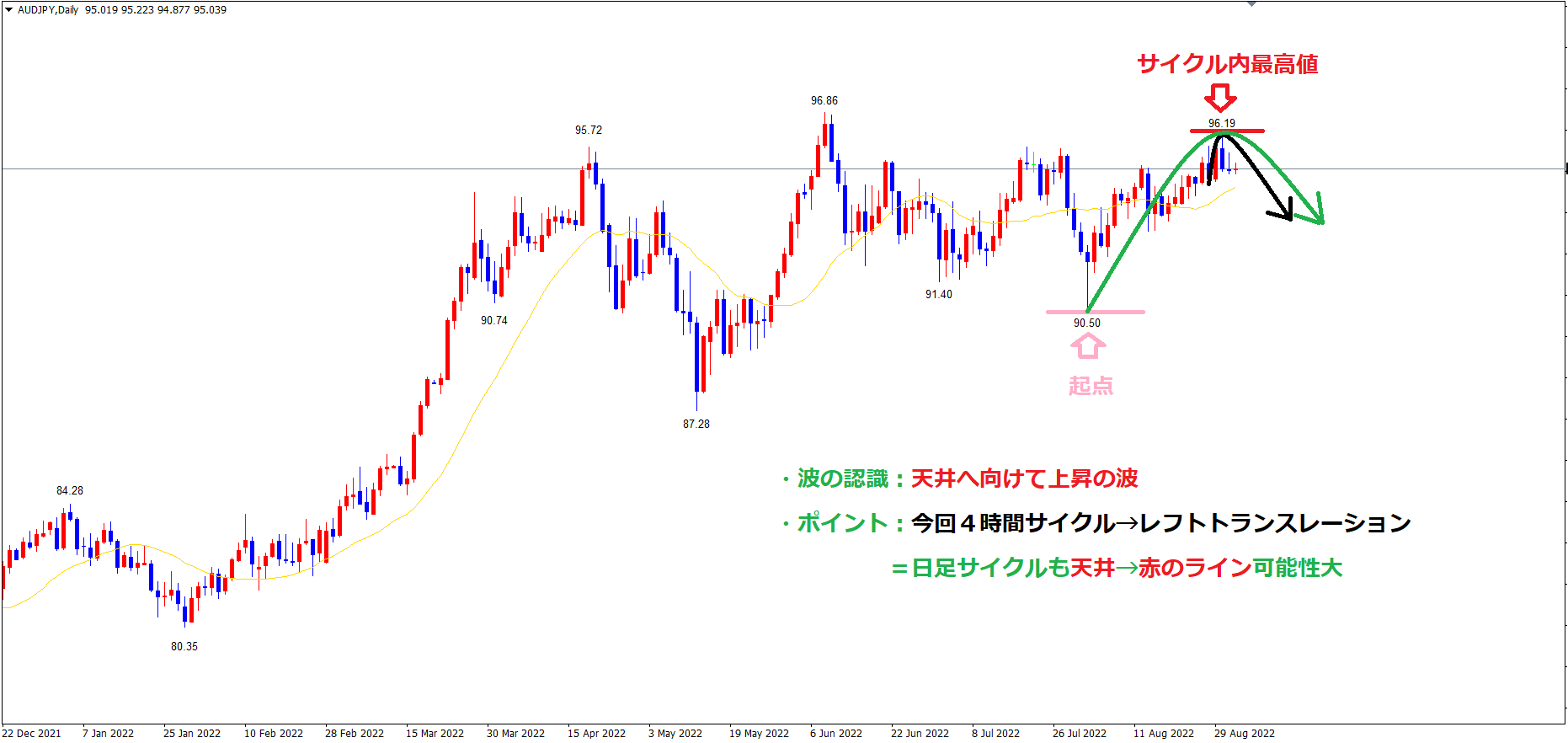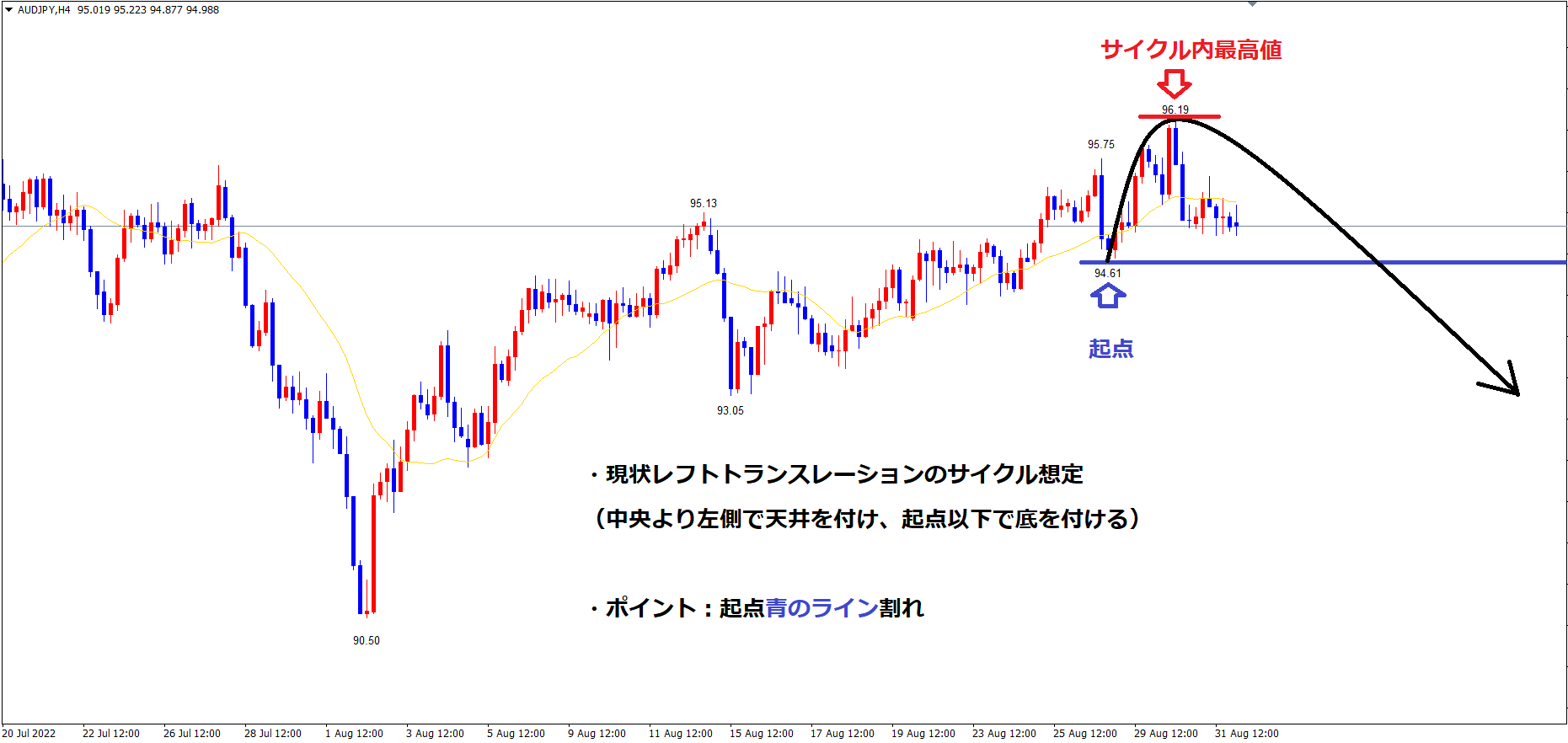 そして、現状ではサイクル内最高値赤のライン96.19を11本目に付けているので、レフトトランスレーションのサイクルを形成する事が考えられます。