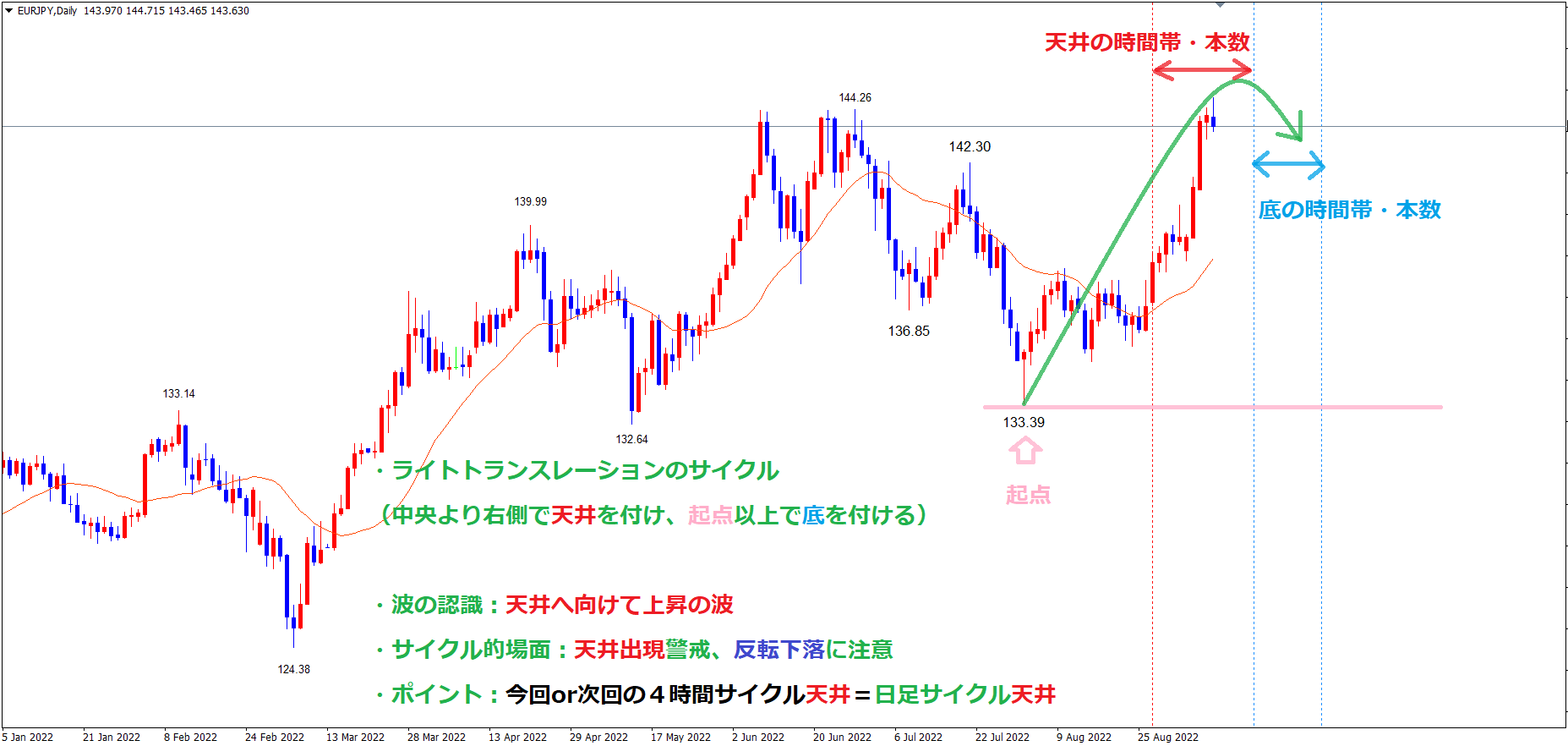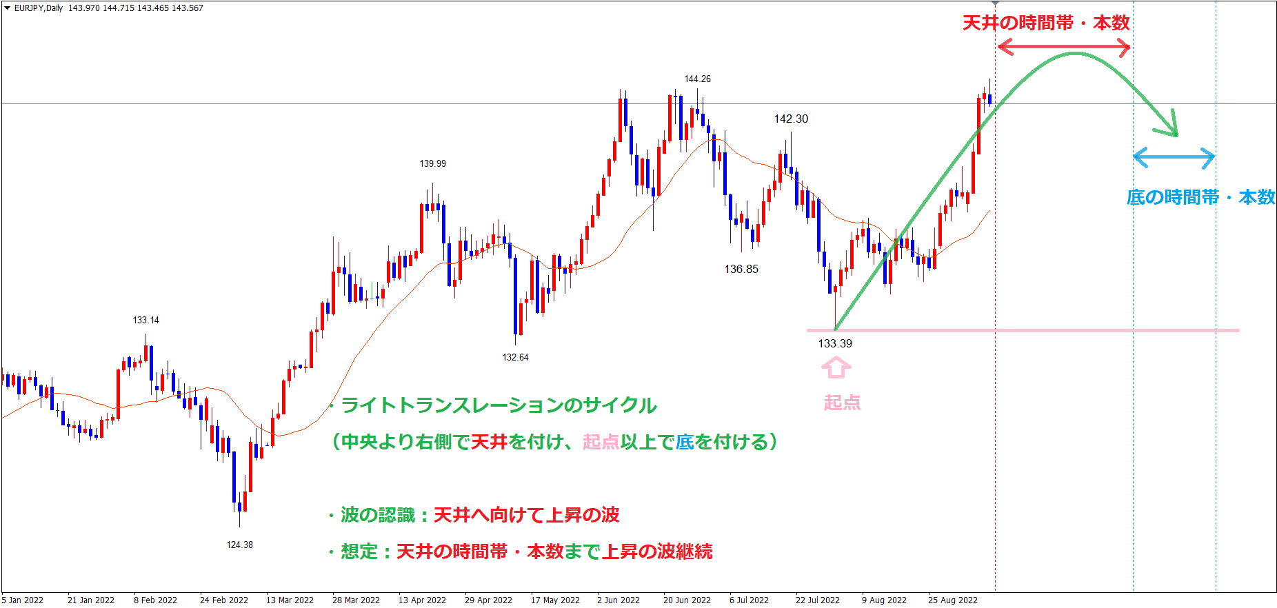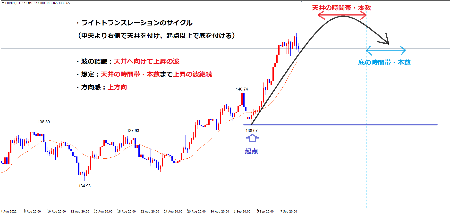 このサイクルは中央(縦赤のライン)より右側で高値更新しているのでライトトランスレーションのサイクルを形成する可能性が高いです。