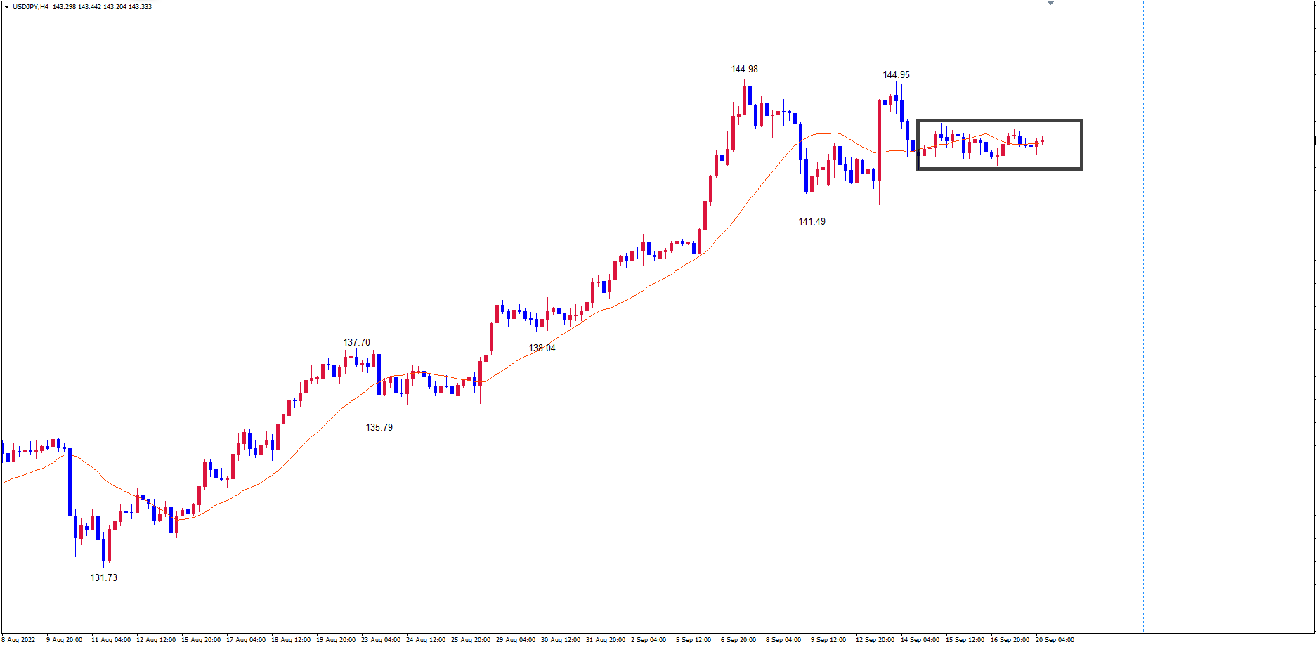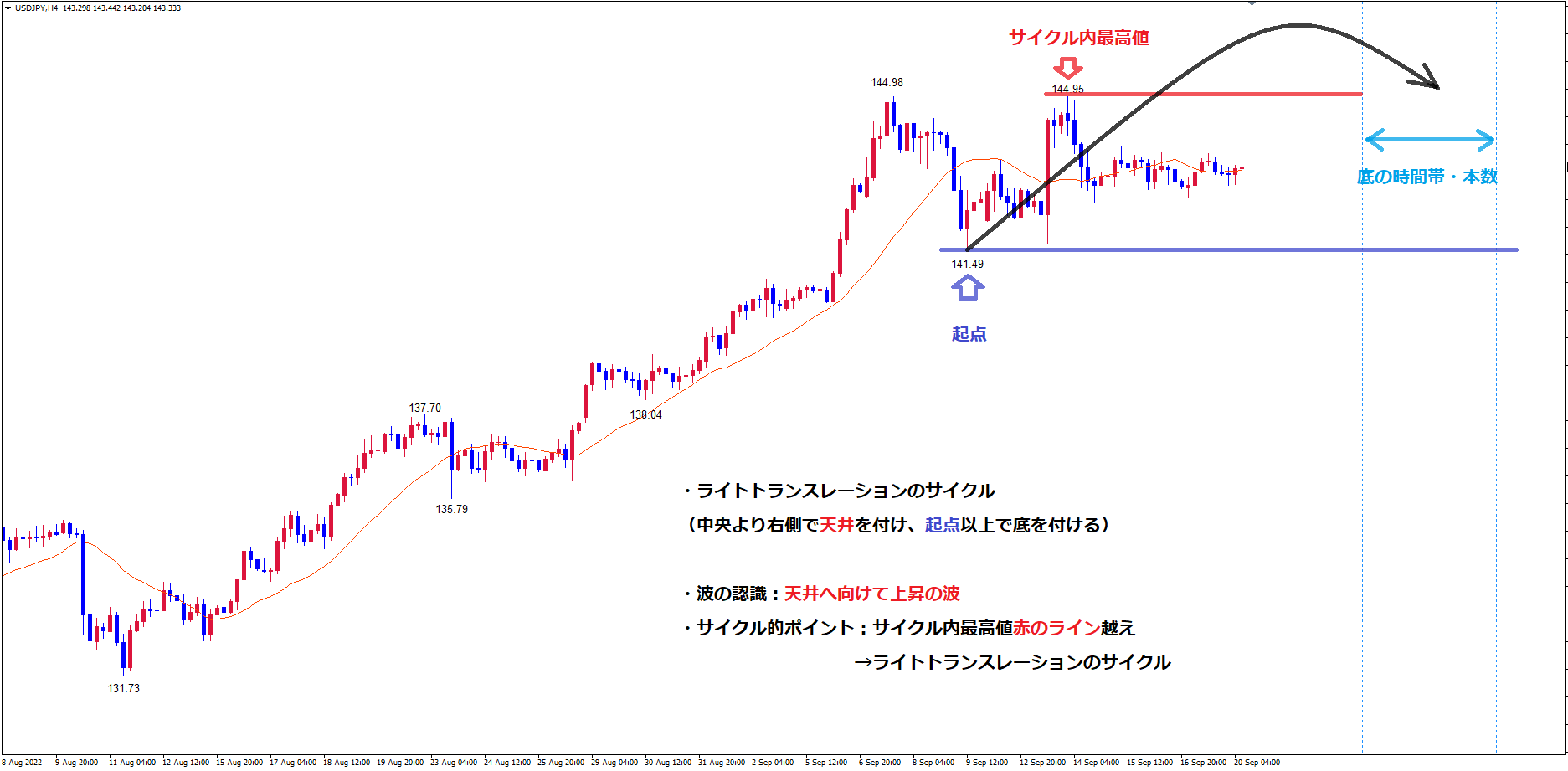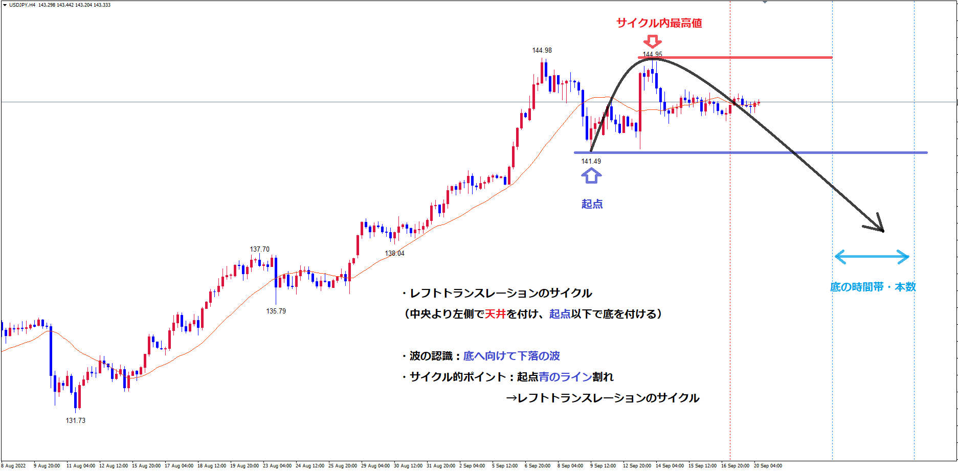 赤のライン144.95は中央(縦赤のライン)より左側で付けた高値なのでレフトトランスレーションのサイクルを形成する事が考えられます。