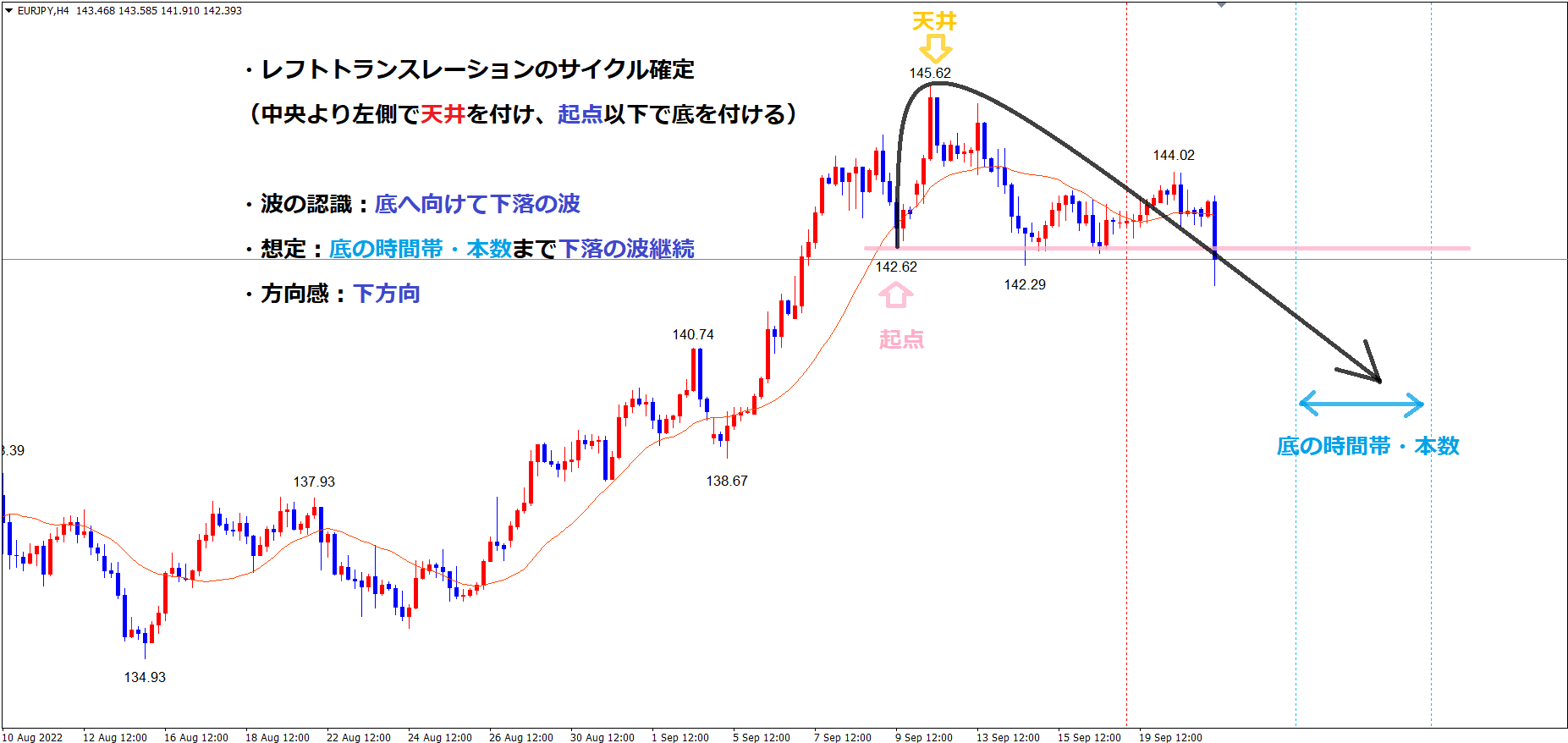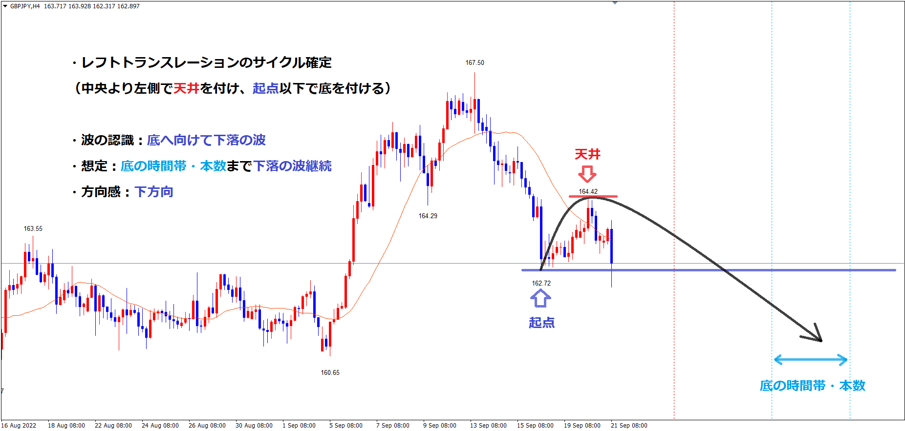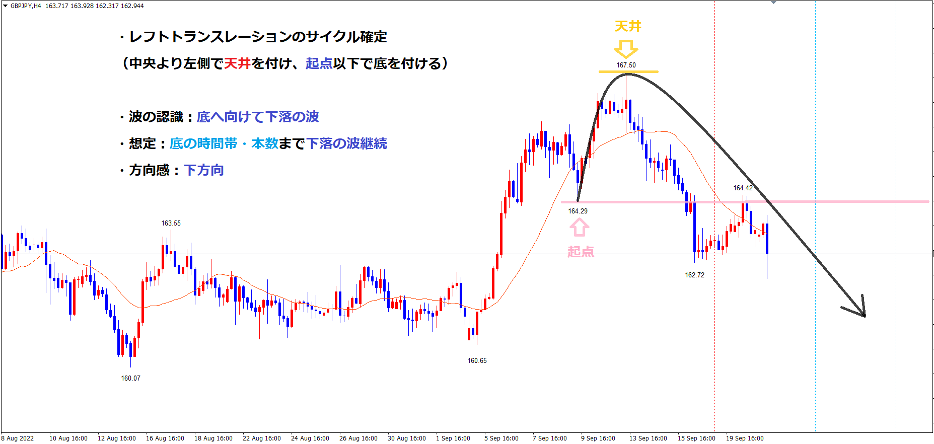 同じく起点の黄のラインを割れているので、レフトトランスレーションのサイクルが確定していて、現在は底へ向けて下落の波で、