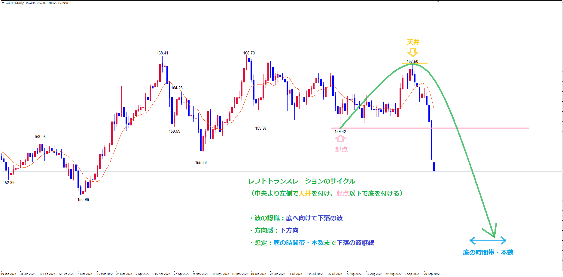 このサイクルは既に起点の青のラインを割れているのでレフトトランスレーションのサイクルという事が確定しています。