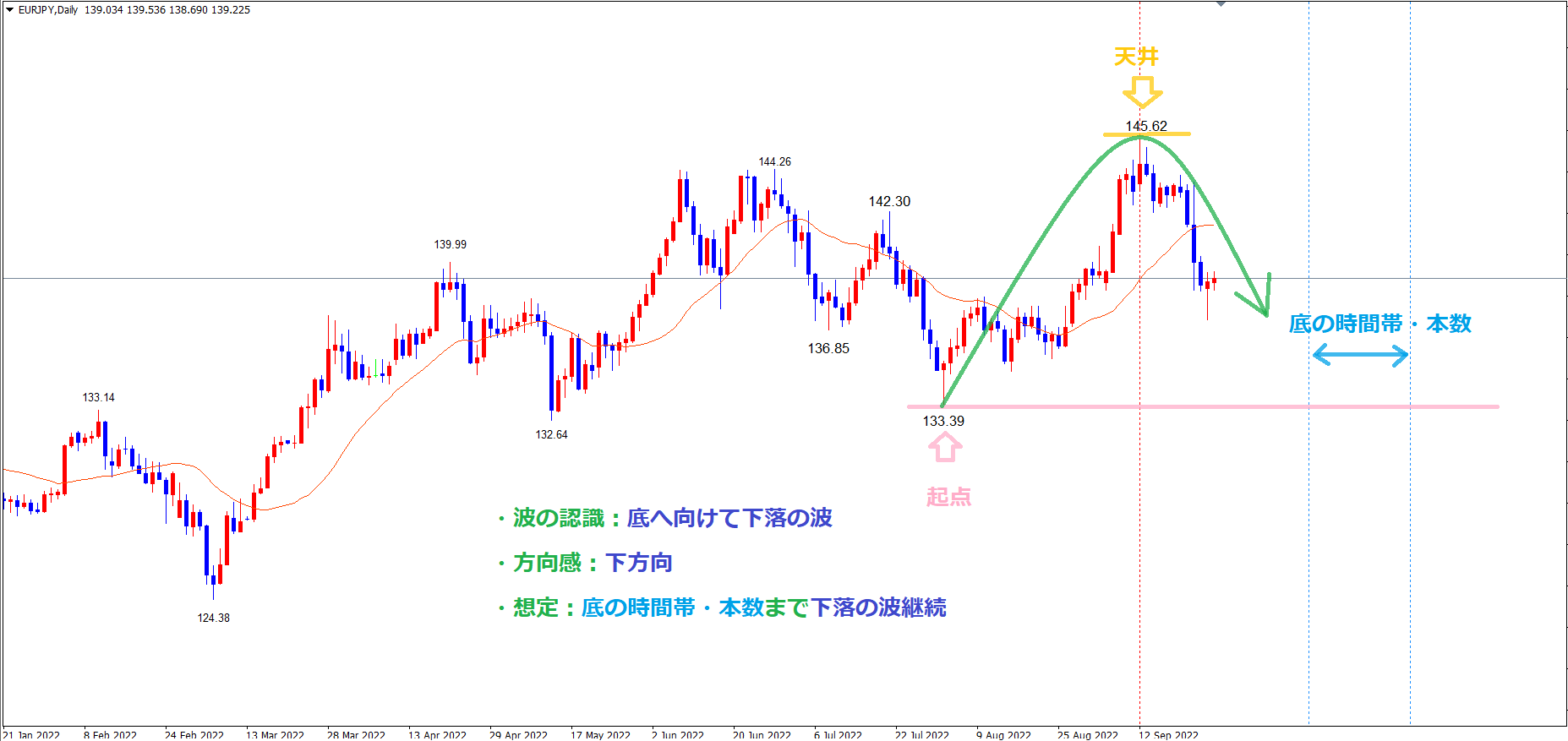 現在サイクル的波の認識は、天井赤のライン144.02から底へ向けて下落の波です。