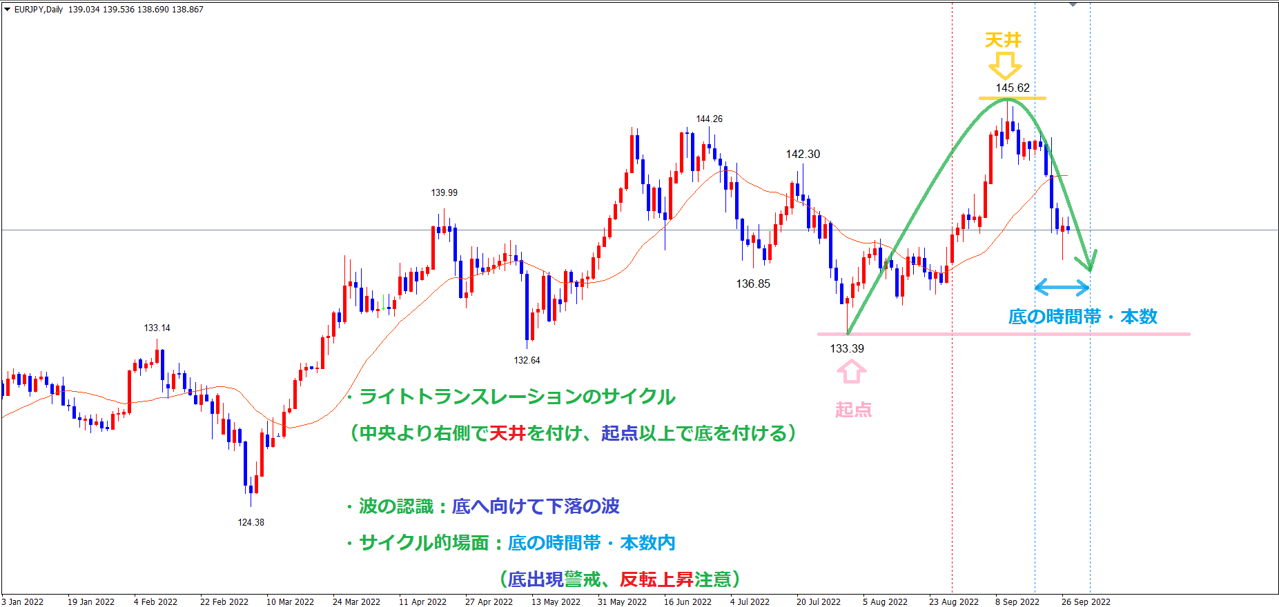 ユーロ円のハーフプライマリーサイクルもレフトトランスレーションのサイクルで、