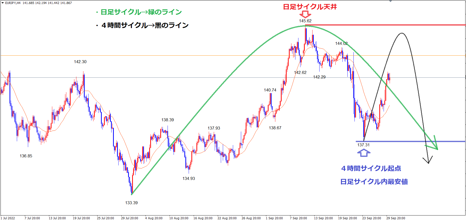 ②ユーロ円に関しては理論的には9/26の安値で日足サイクルレベルで底を付けて反転していてもおかしくない(方向感が上方向に切り替わっていてもおかしくない)から