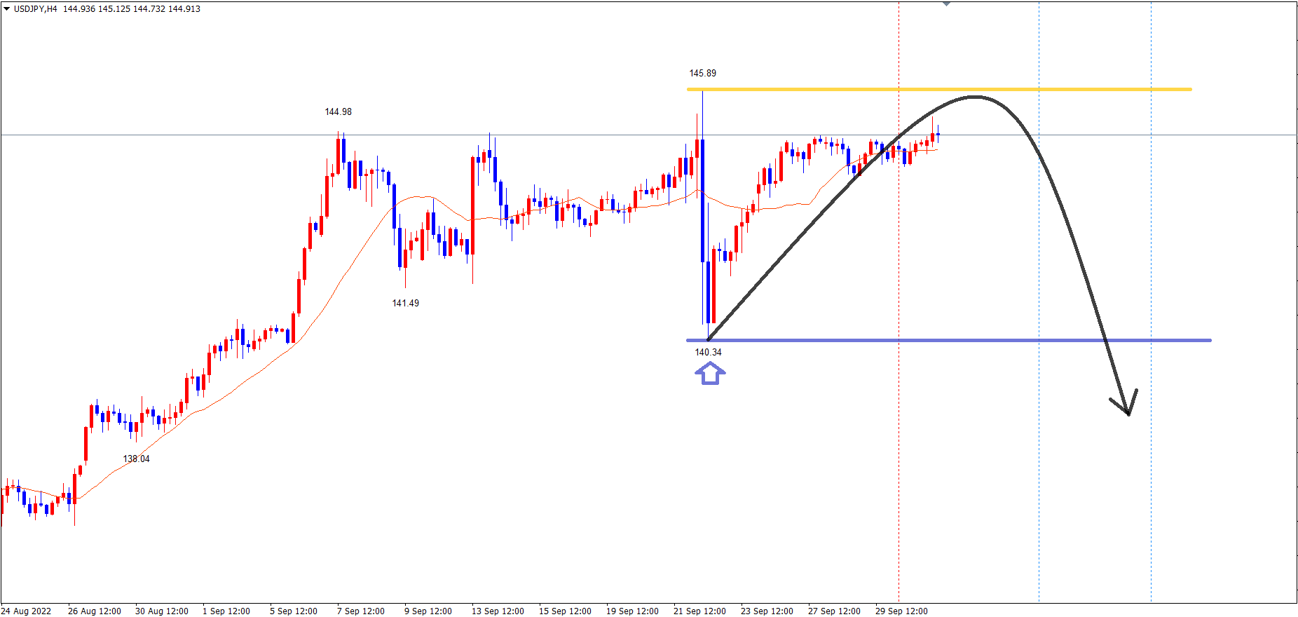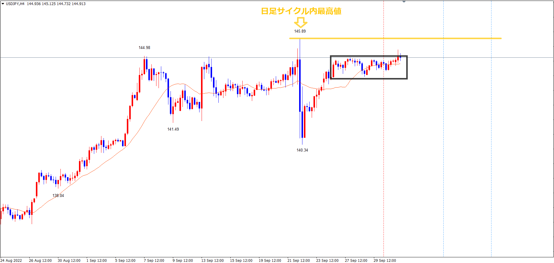 以前から解説している様に、日足・週足・月足レベルでは9/22の高値黄のライン145.89が最高値となっている状況で、