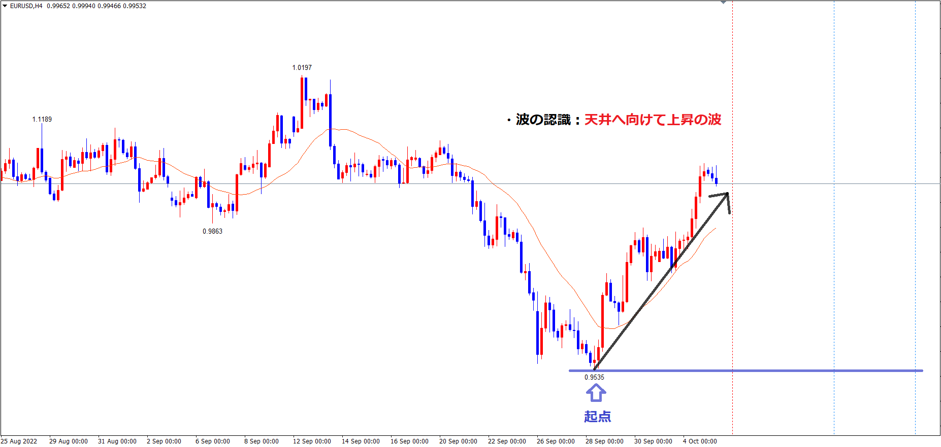 ユーロドル4時間サイクルは、起点の青のライン0.9535から現在31本目です。