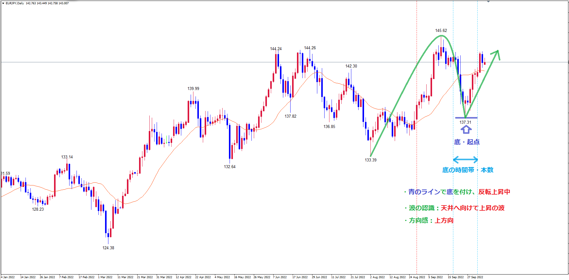 142.29からの4時間サイクルの底青のラインで日足サイクルも底を付けて、反転している形で考えています。