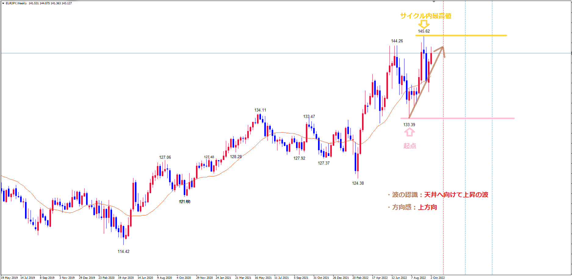 ただ、現状ではサイクル内最高値黄のライン145.62を超えていないので、週足の方向感に関してはあまり決めつけず、フラットに見ています。