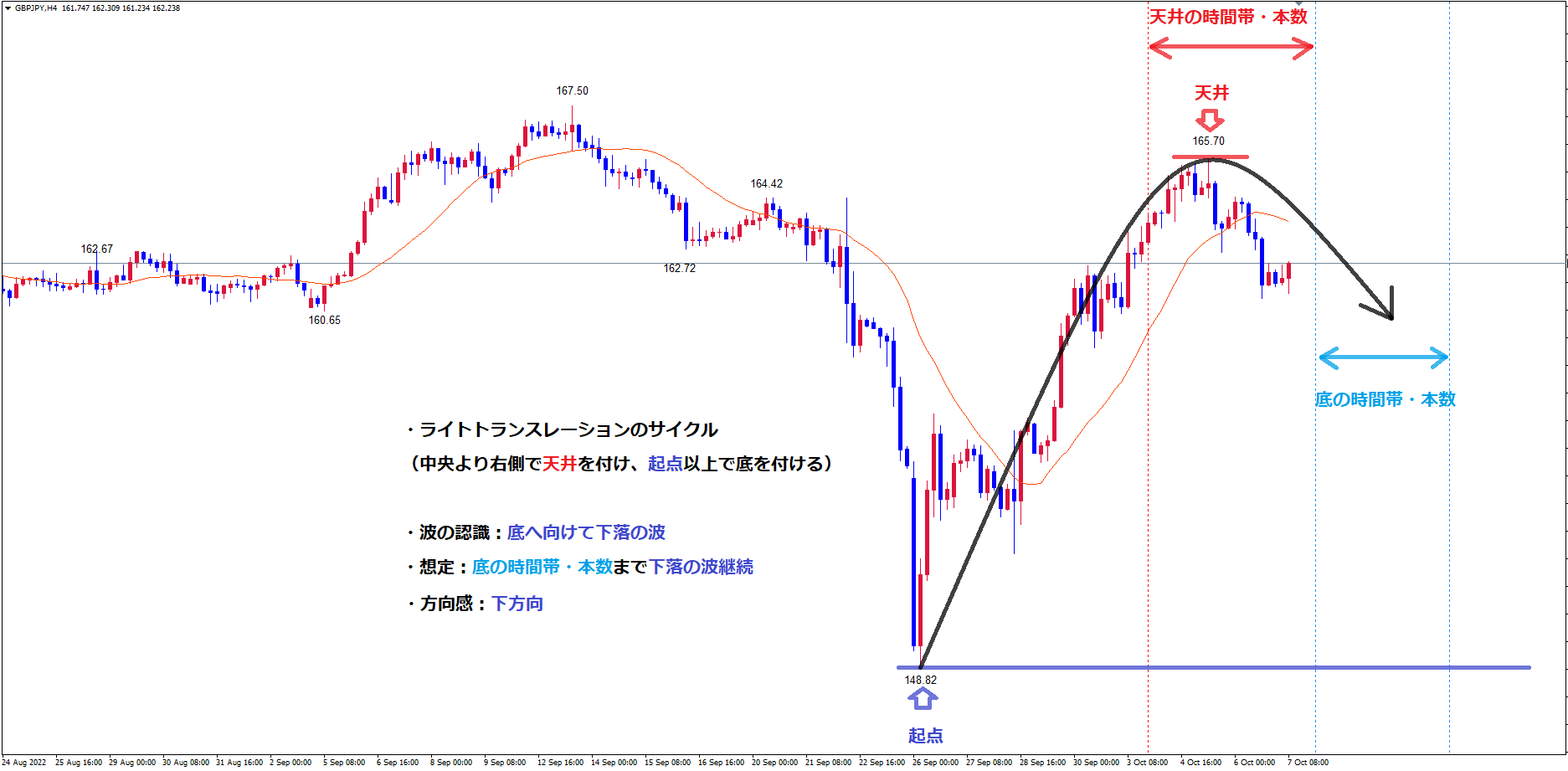 先程解説した青のラインからの4時間サイクルがライトトランスレーションのサイクルで、起点青のラインを割れずに底を付ける可能性が高い。