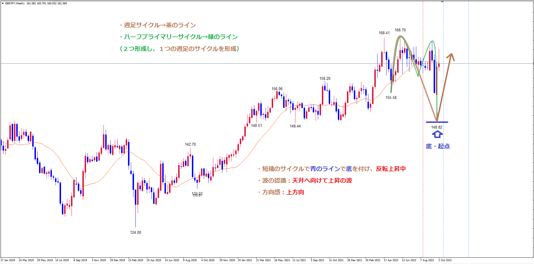 これまで見ていた、155.58が起点の週足のサイクルも青のライン148.82で底を付けて、反転している事が考えられます。