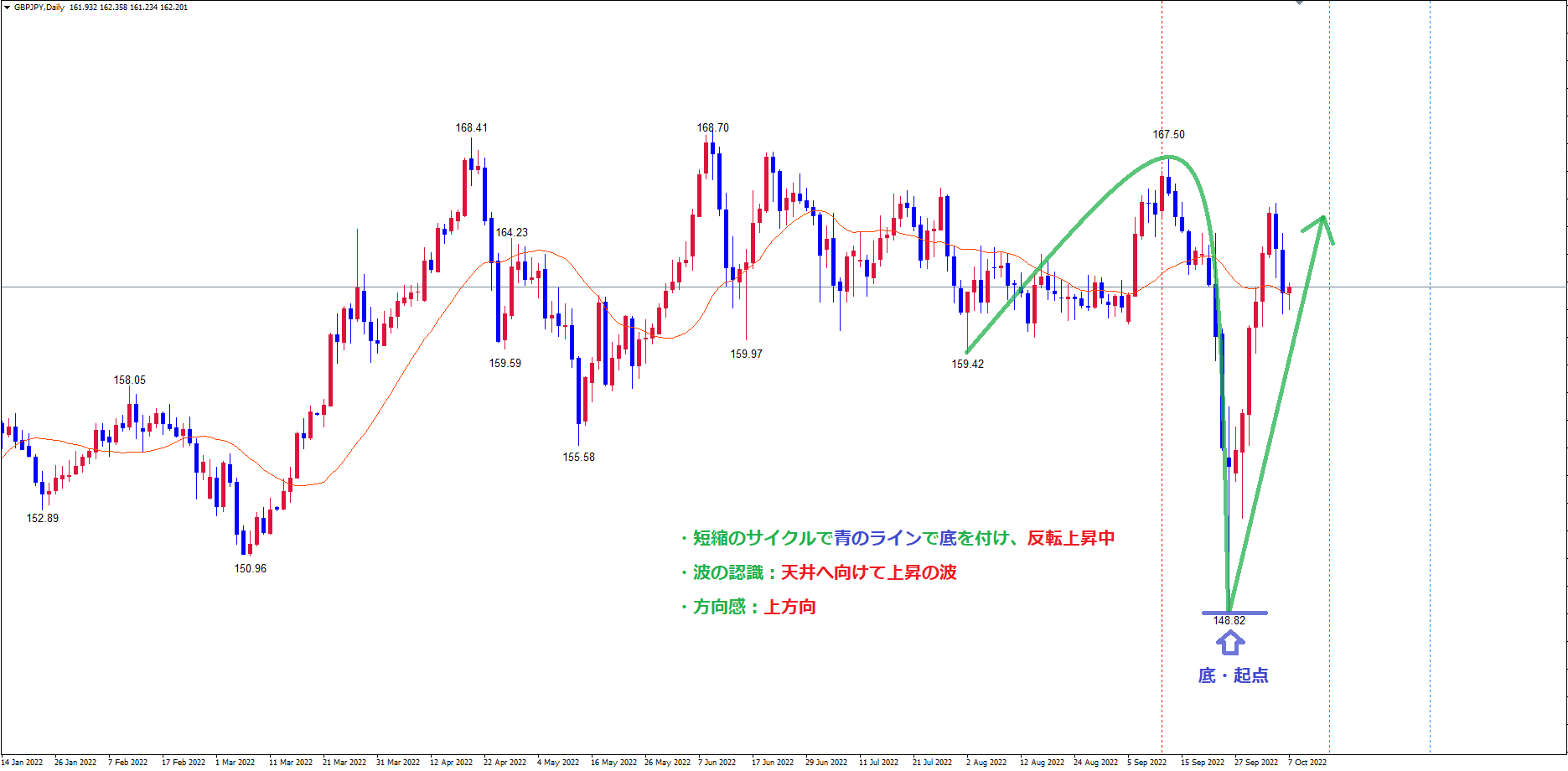 ポンド円の日足サイクルは、前回下記画像の様に青のライン148.82で反転している形を考えていました。