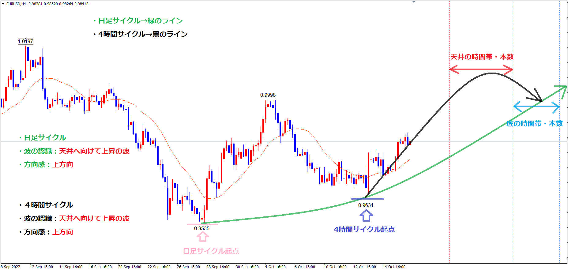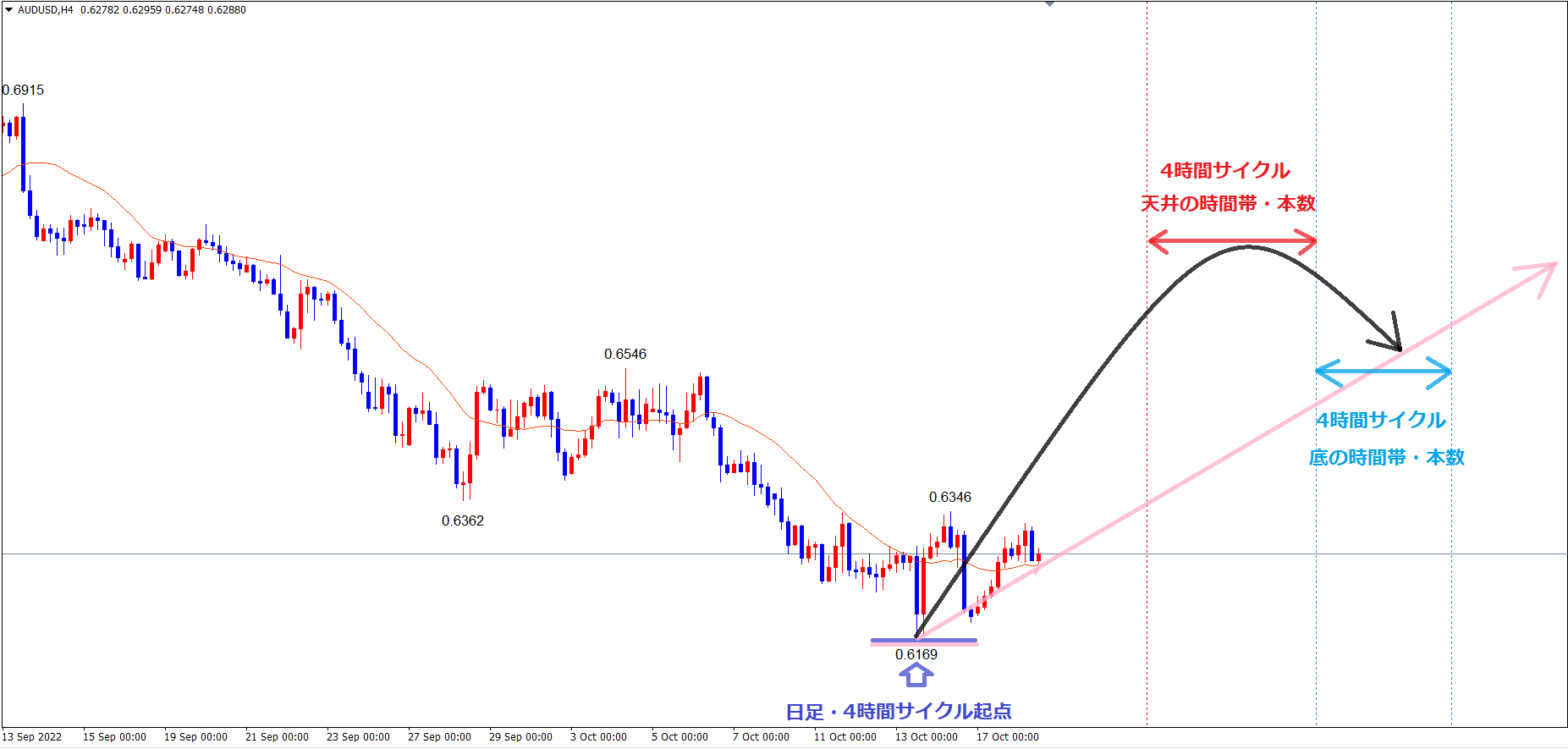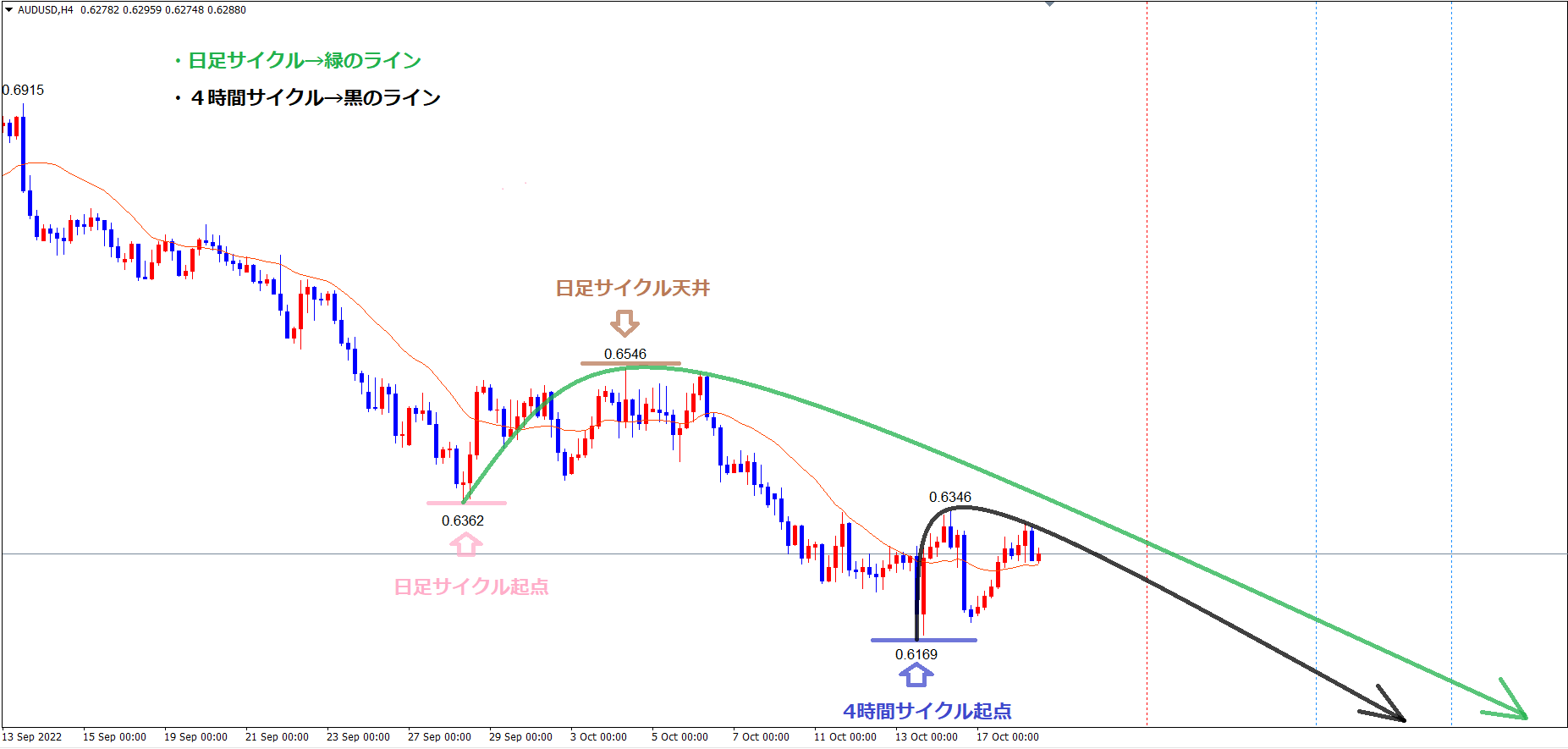 *サイクルは起点からまずは天井へ向けて上昇し、起点から一番高い高値で天井を付けて下落し、天井から一番安い安値で底を付ける。