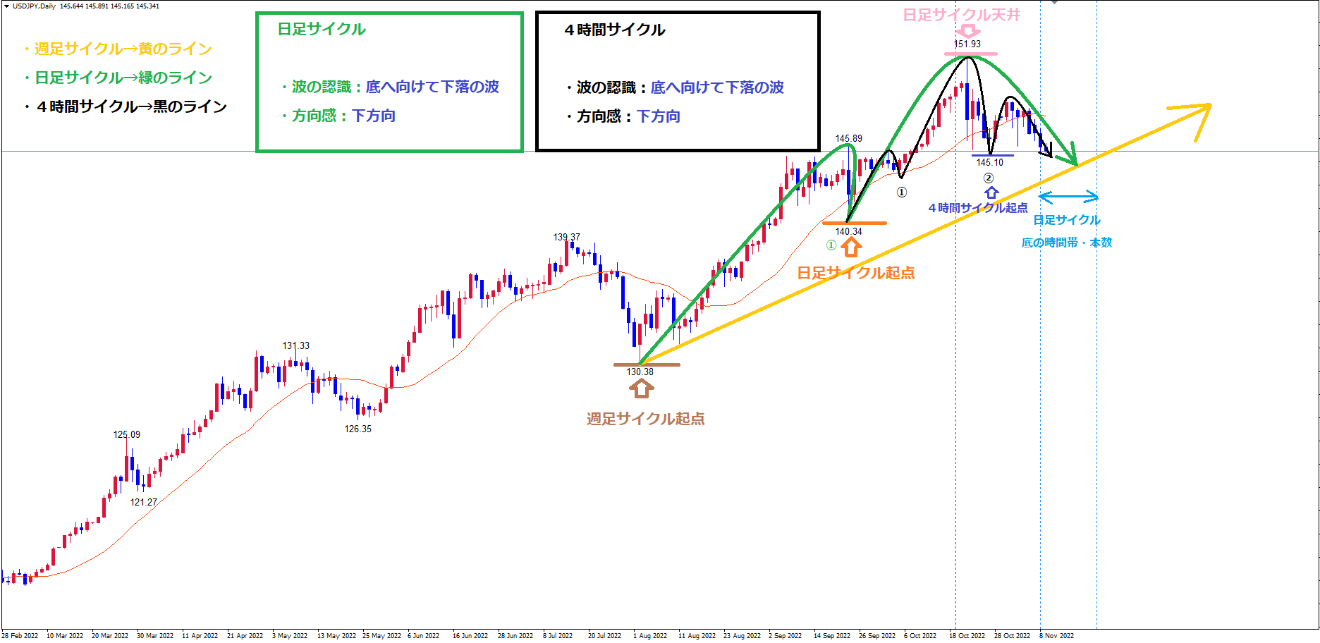 イメージとしては、日足の下落の波の戻し高値となる形で天井を付け、日足の下落の波の推進派となる下落で起点青のライン(日足サイクル内最安値145.10)以下まで下落し底を付けるイメージです✔️