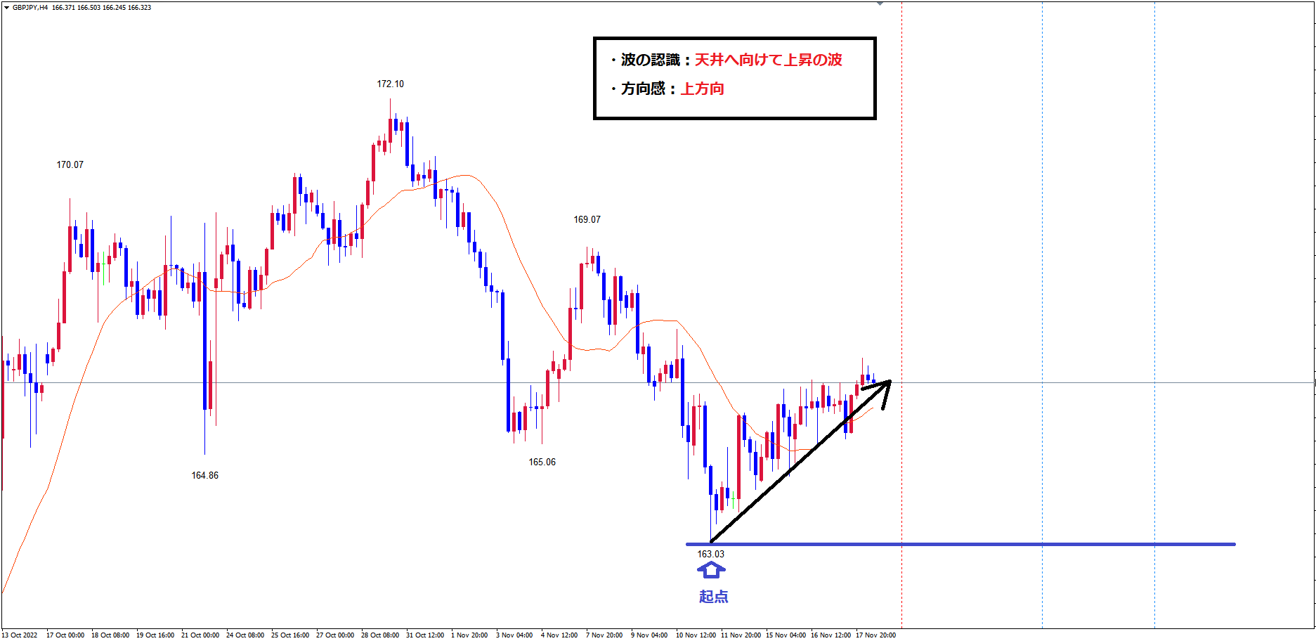 この場合、サイクル天井へ向けて上昇の波、方向感:上方向 という認識になります。