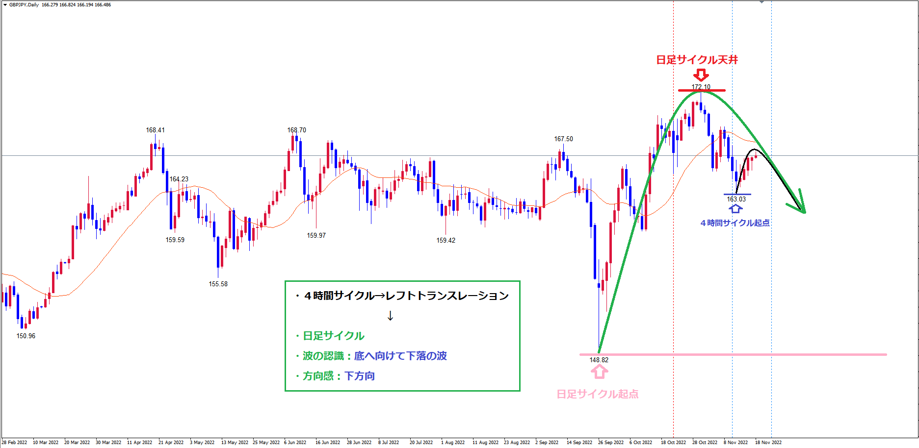 ・今回4時間サイクル→レフトトランスレーション = 桃のラインからの日足サイクル継続(底へ向けて下落の波、方向感:下方向)