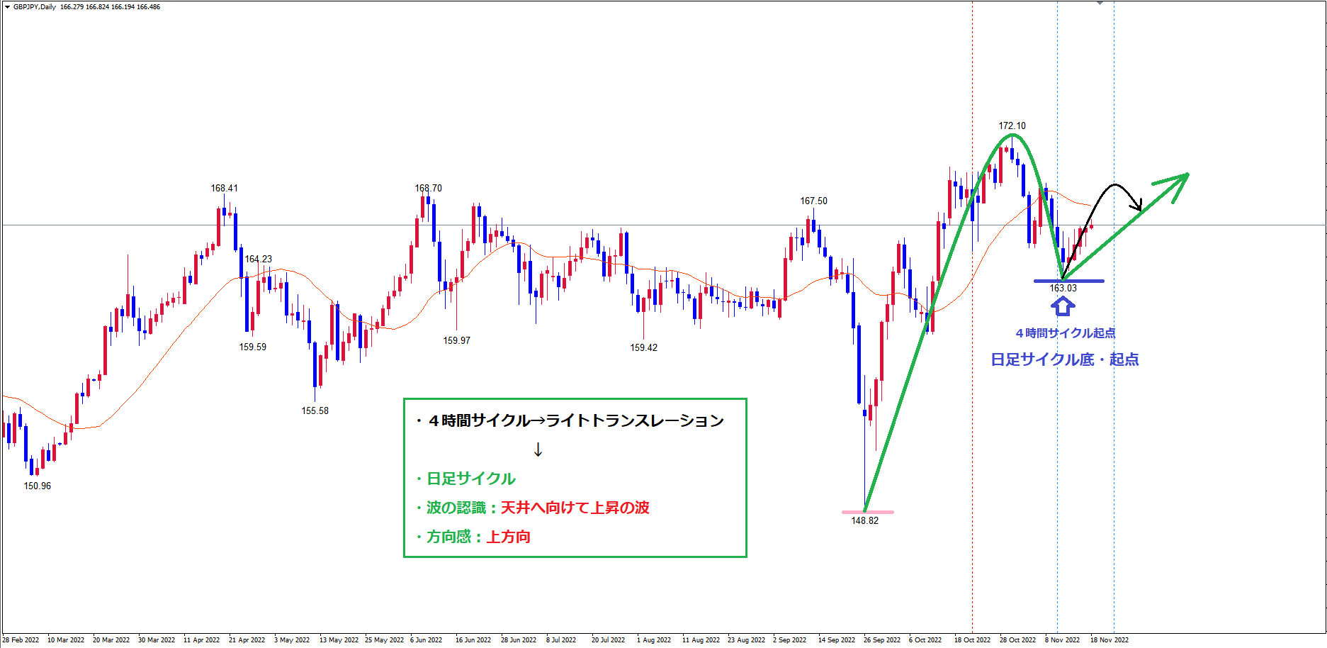 ・今回4時間サイクル→ライトトランスレーション = 日足サイクル青のラインスタート(天井へ向けて上昇の波、方向感:上方向)