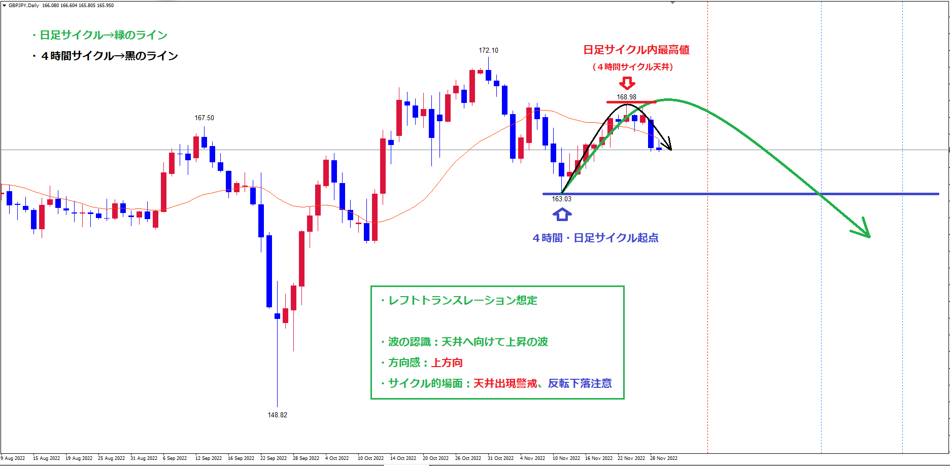 また、クロス円は似たサイクル的進行をする傾向があるので、ポンド円の日足サイクルもレフトトランスレーションのサイクル想定で見ています。