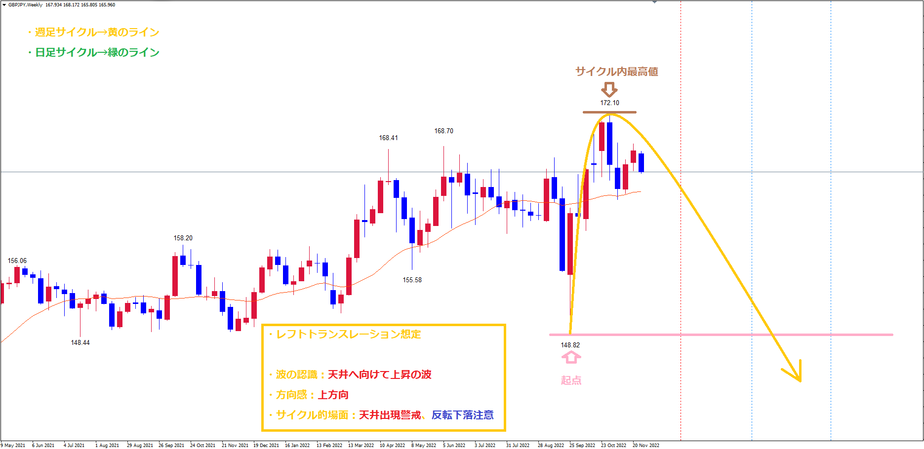 なので、ポンド円の週足のサイクルもレフトトランスレーションのサイクル想定で、