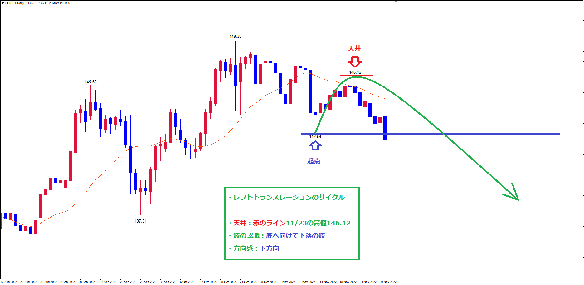 この日足サイクルは既に起点の青のラインを割れている事でレフトトランスレーションのサイクルが確定し、