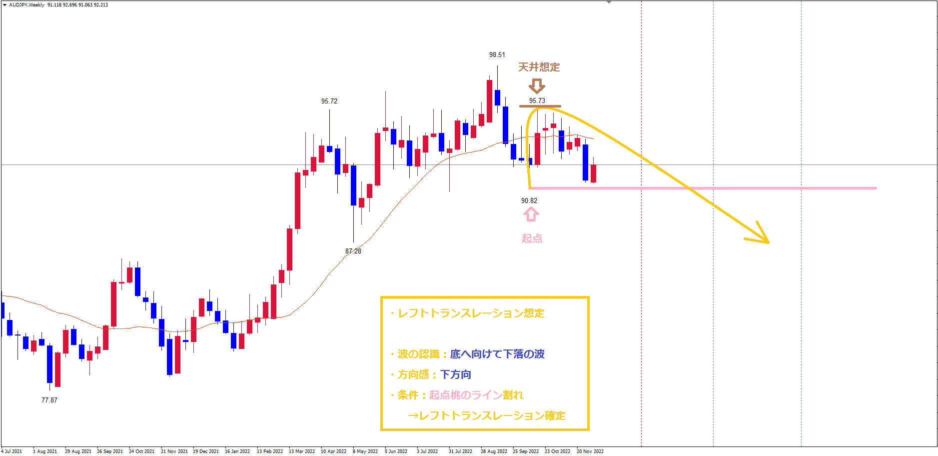 そして、カナダドル円の週足サイクルがレフトトランスレーションを確定させ、直近の最高値で天井を付けている状況なので