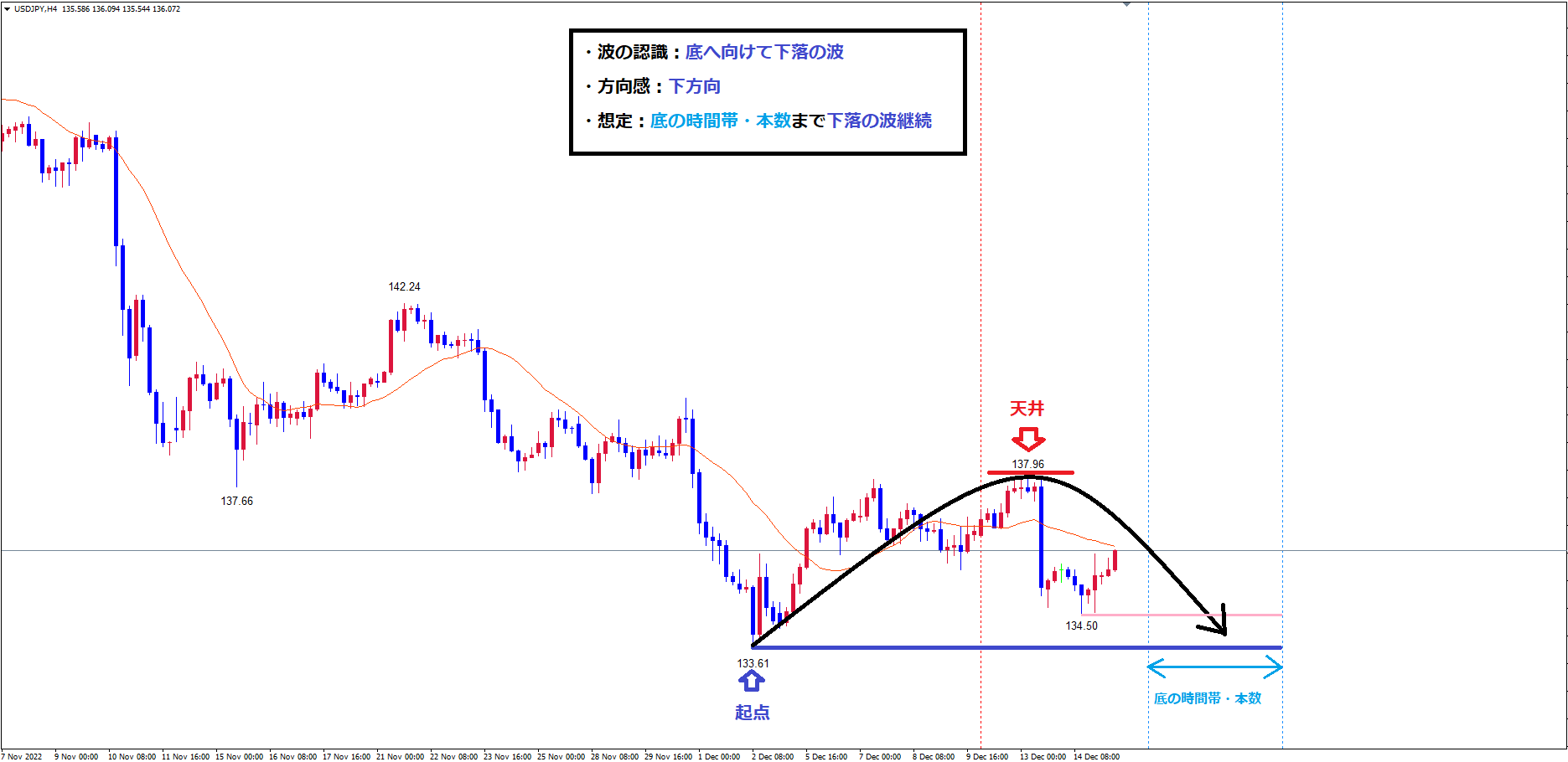 まだ底の時間帯・本数に入っていないので、まだ底へ向けて下落の波継続し、直近のサイクル内最安値桃のラインを割れて底を付けるのが基本です。