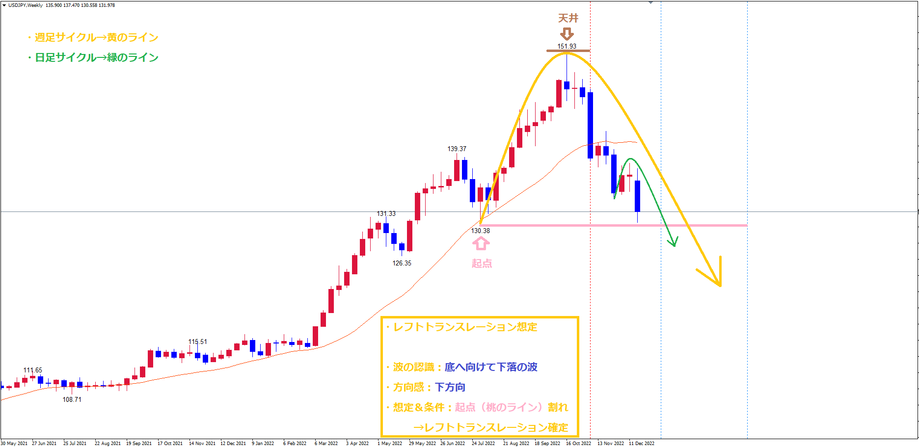 また、週足サイクルもレフトトランスレーション想定で、今後週足レベルで起点桃のライン以下まで下落する想定です✔️