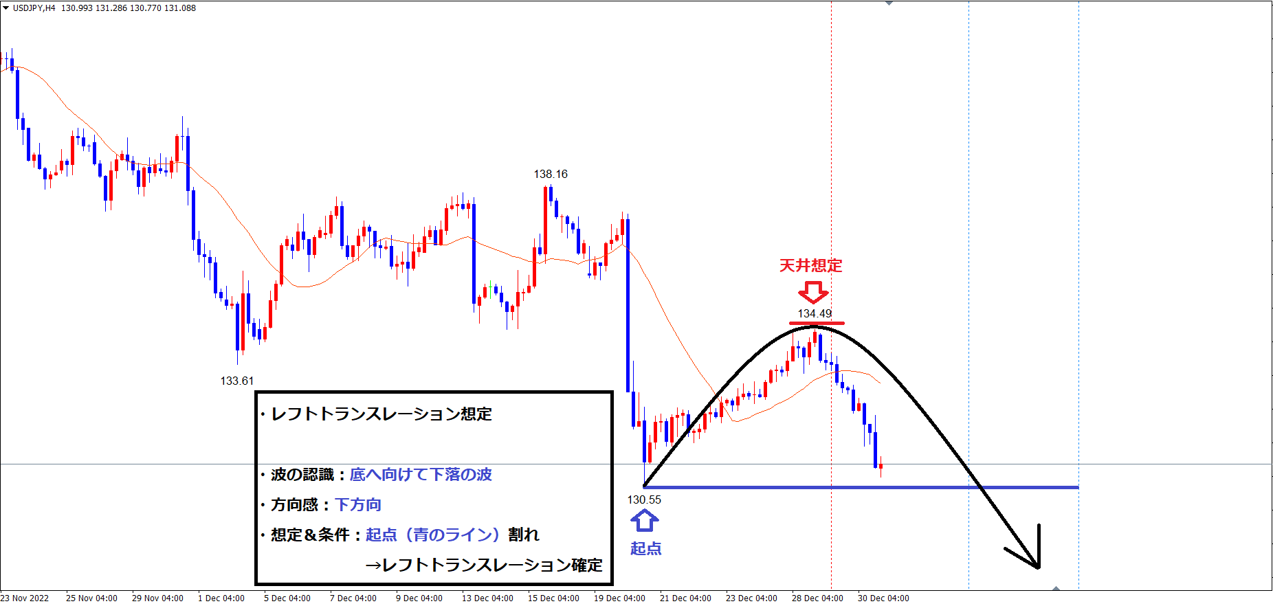 日足サイクルが底へ向けて下落の波である事からレフトトランスレーションのサイクルを想定しています。
