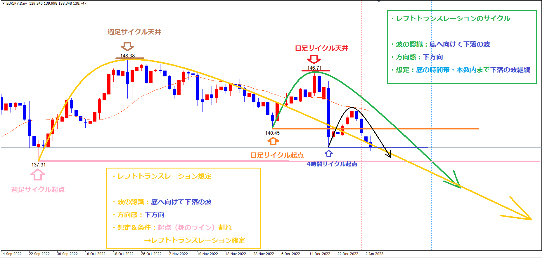 そして、想定通りに本日起点青のラインを割れた事で、レフトトランスレーションのサイクルが確定しました。