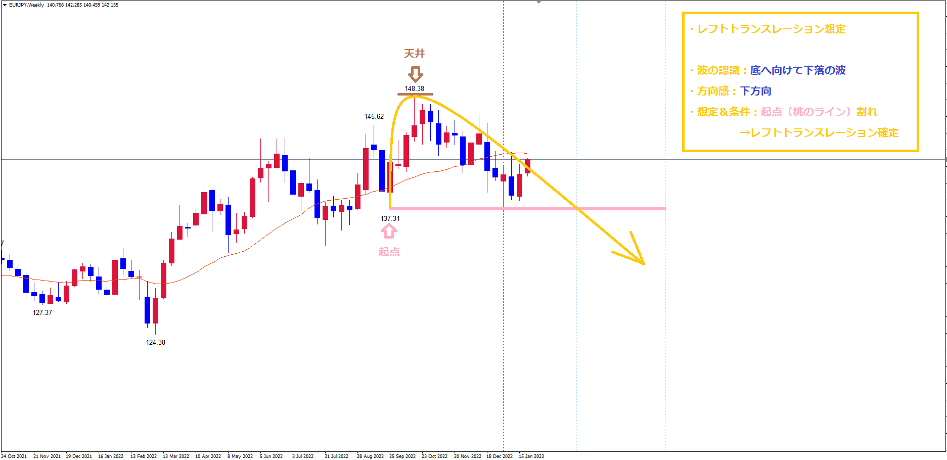 また、週足サイクルもレフトトランスレーション想定なので、今後週足レベルで起点桃のライン以下まで下落する想定です✔️