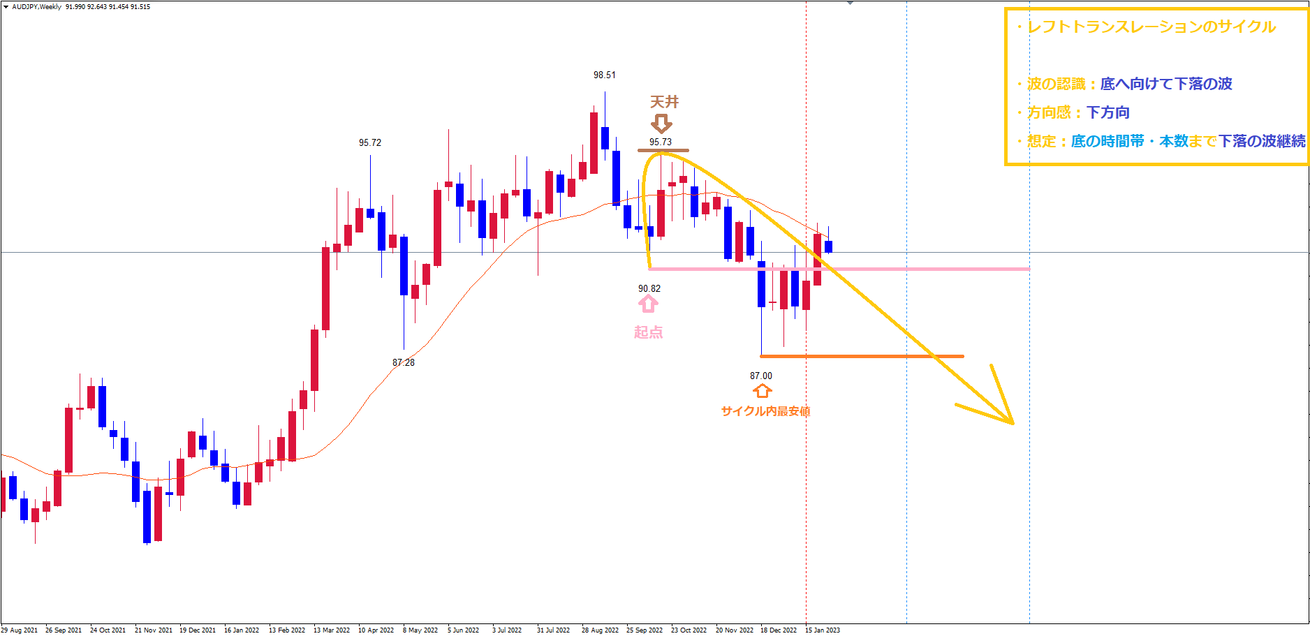 以前から解説した様に、豪ドル円の週足サイクルは、既に起点桃のラインを割れている事で、レフトトランスレーションのサイクルが確定しています。