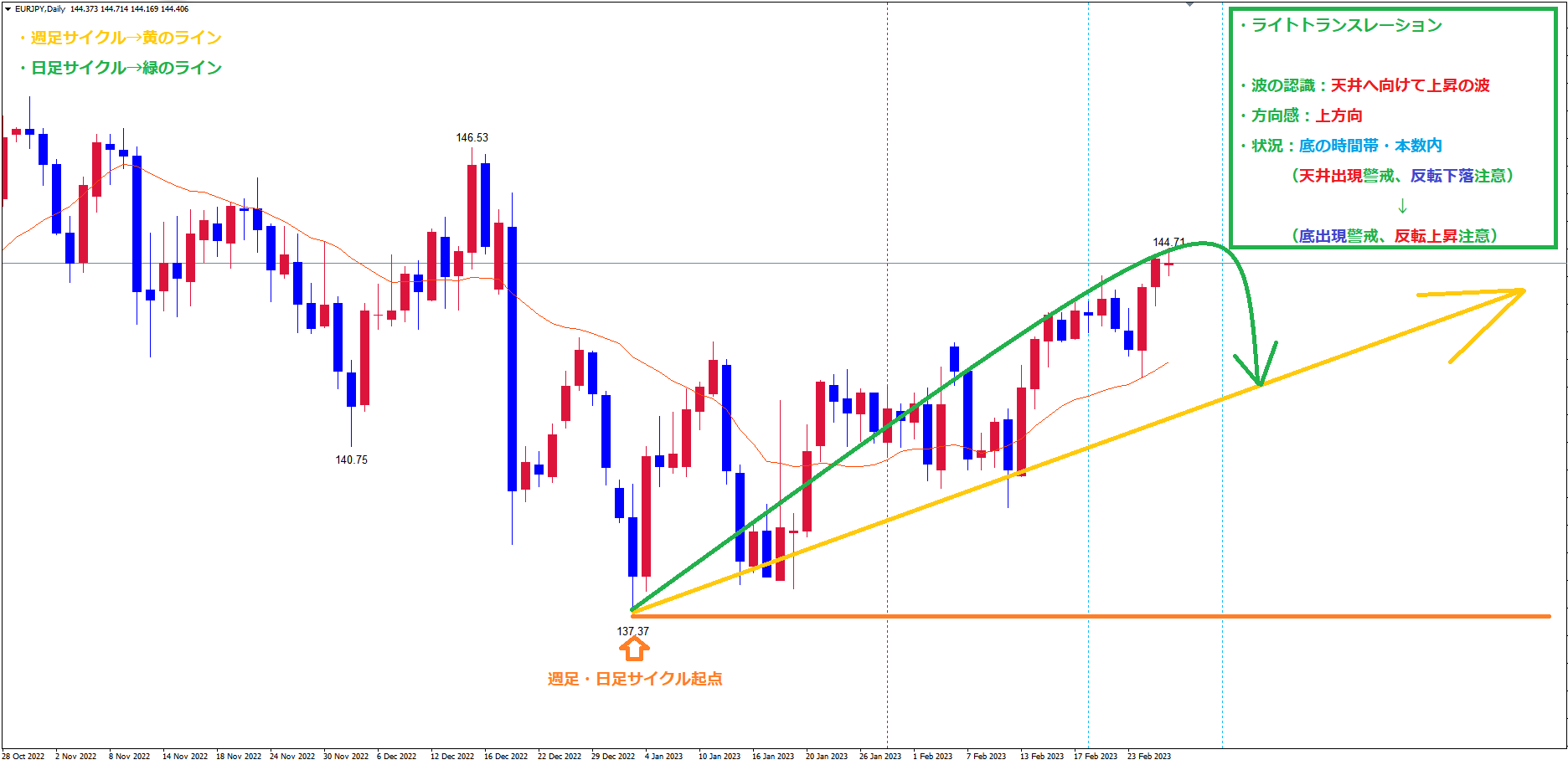 ユーロ円の週足・日足のサイクルは、前回 ユーロ円 環境認識(想定外まで想定し、正しいトレード準備) の記事で解説した、