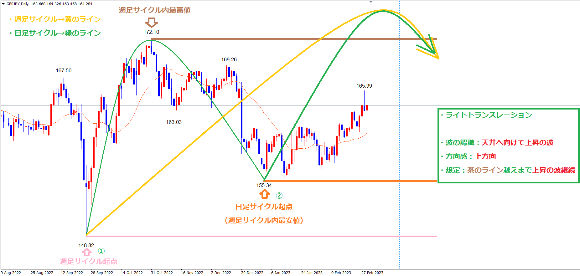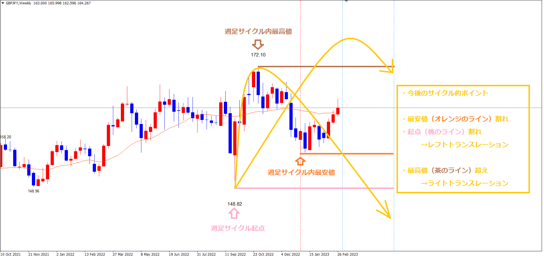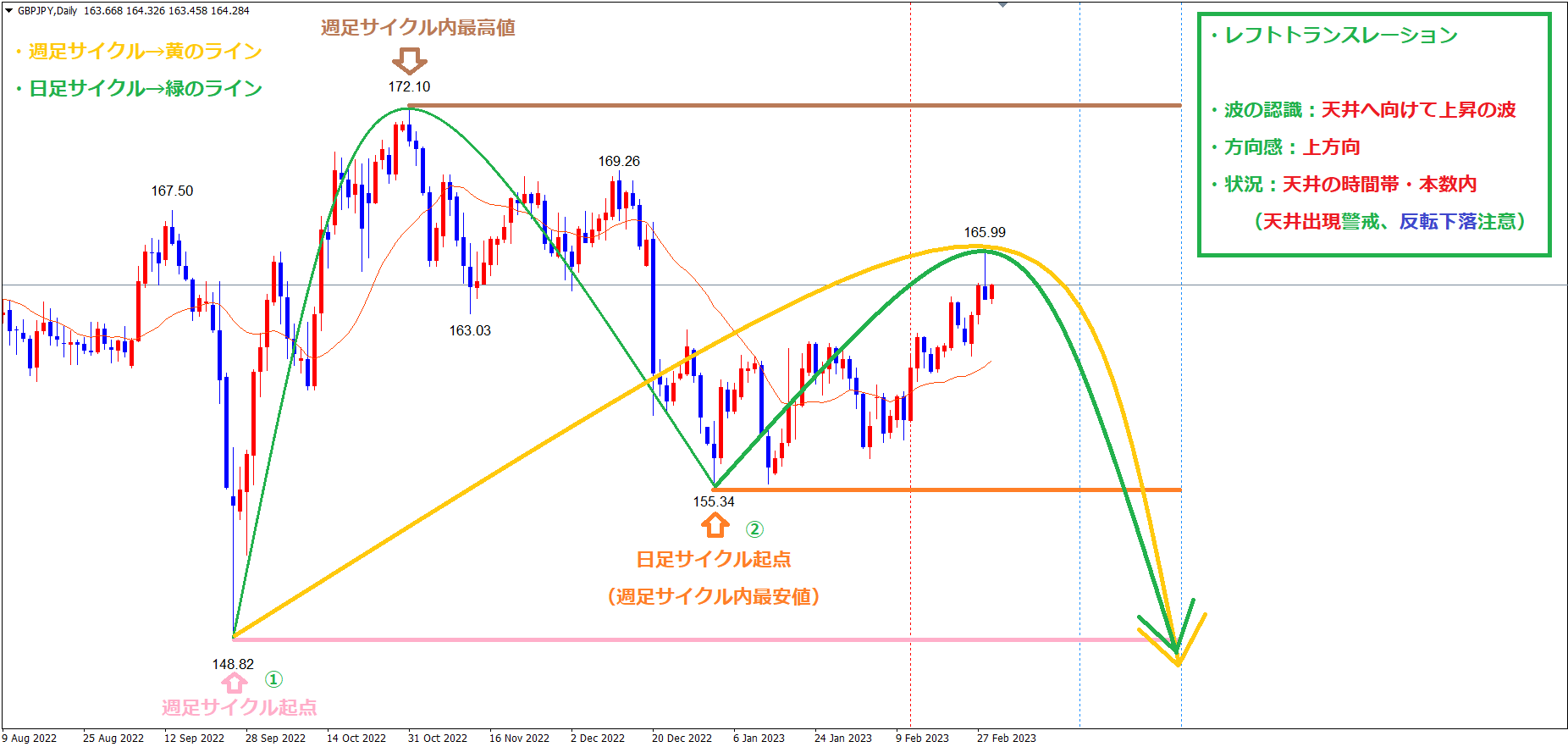 また、茶のラインが天井の場合、週足サイクルはレフトトランスレーションのサイクルで、今後週足レベルで起点桃のライン以下まで下落する展開となります。