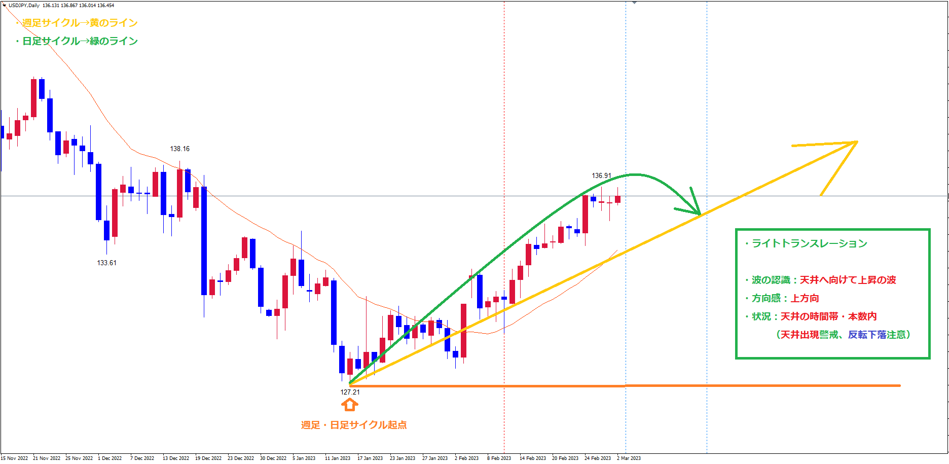 そして、現状では2/28の高値136.91が4時間足・日足でサイクル内最高値となっているので、