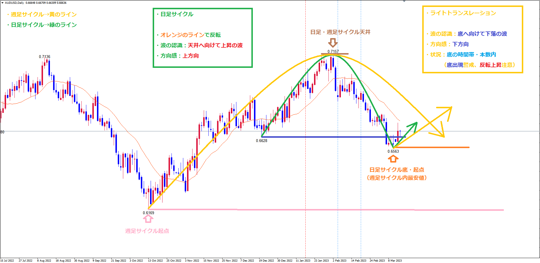 豪ドルドル日足サイクルは、これまで想定している青のラインからのサイクルが延長し、58本目に付けた安値オレンジのラインで底を付けて反転と見て、