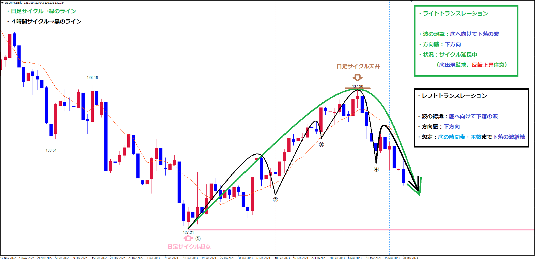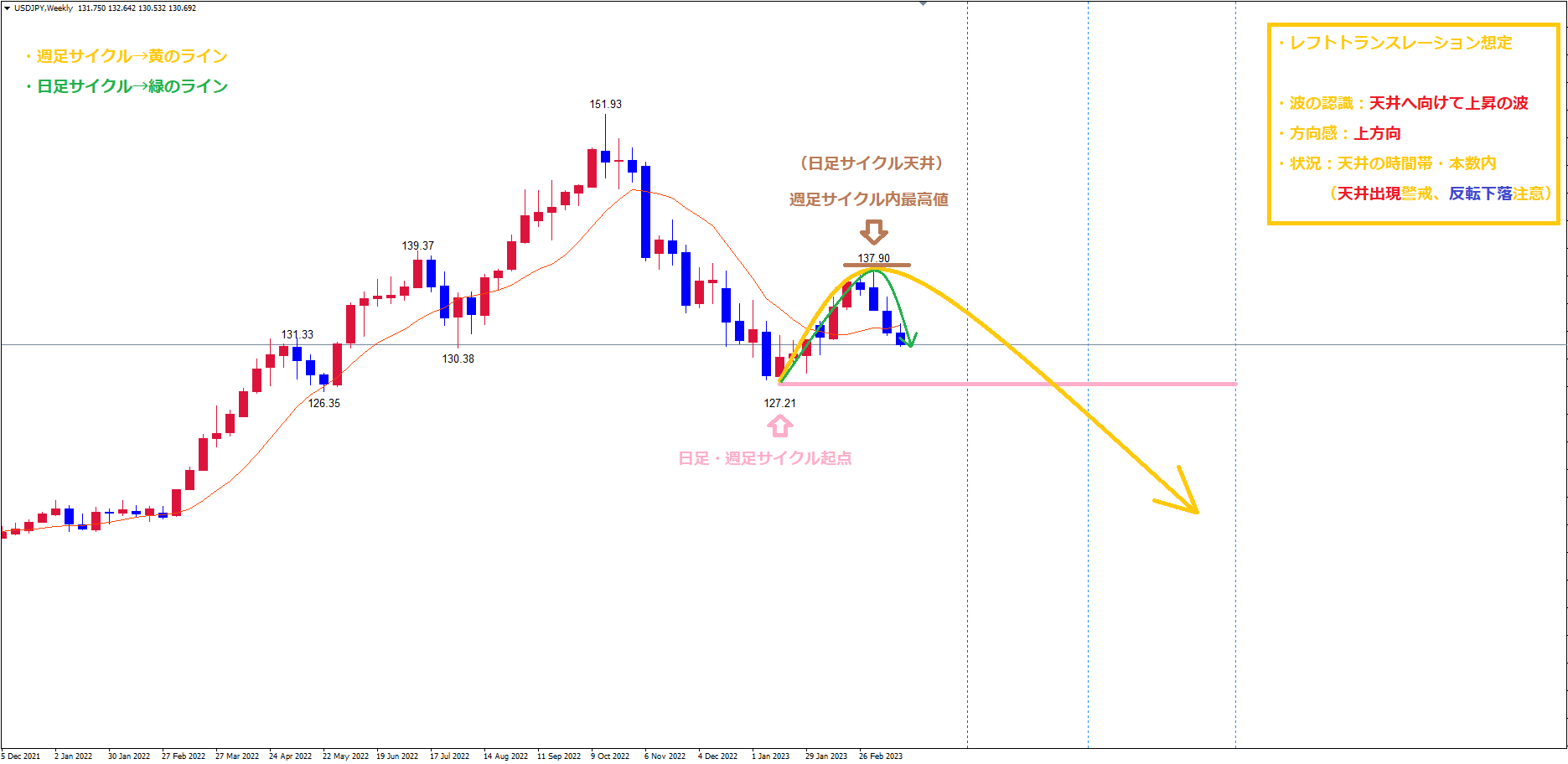 今回日足サイクル天井茶のライン3/8の高値137.90 or 次回の日足サイクル天井 = 週足サイクル天井 というイメージです。