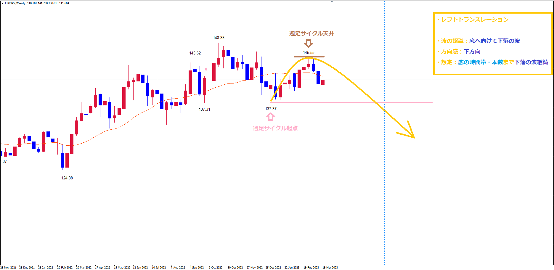 以前から解説している様に、月足レベルで下落している事が考えられるので、今回の週足サイクルもレフトトランスレーションを想定しています。