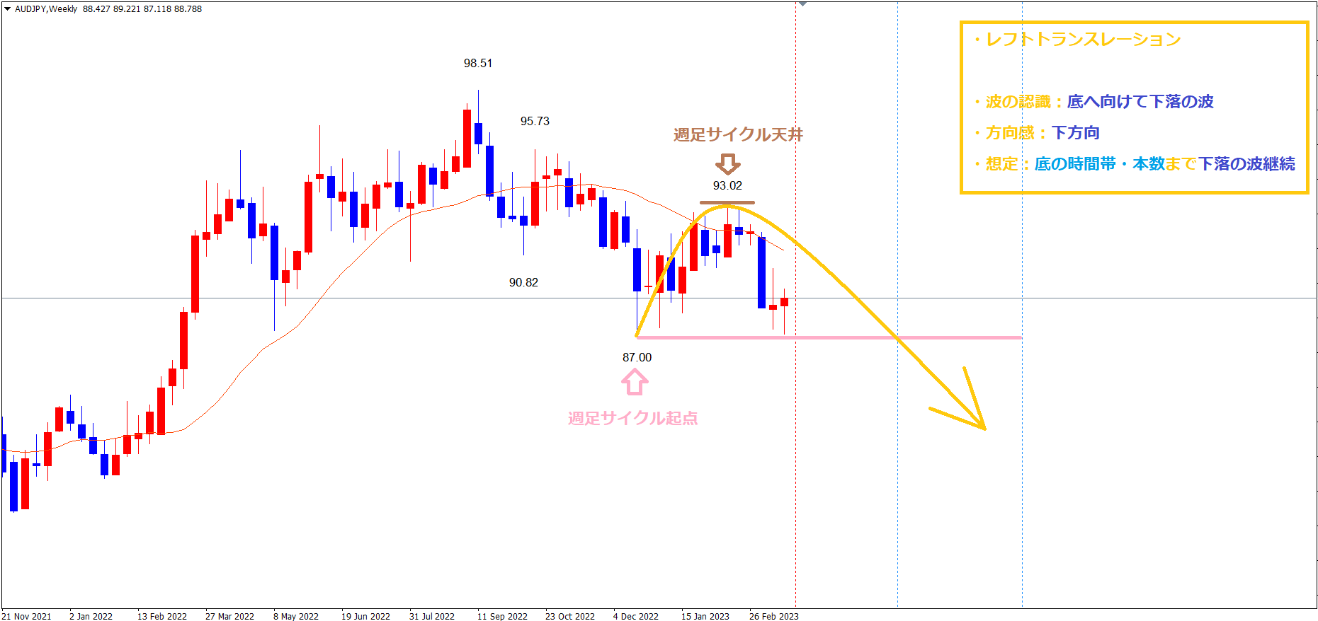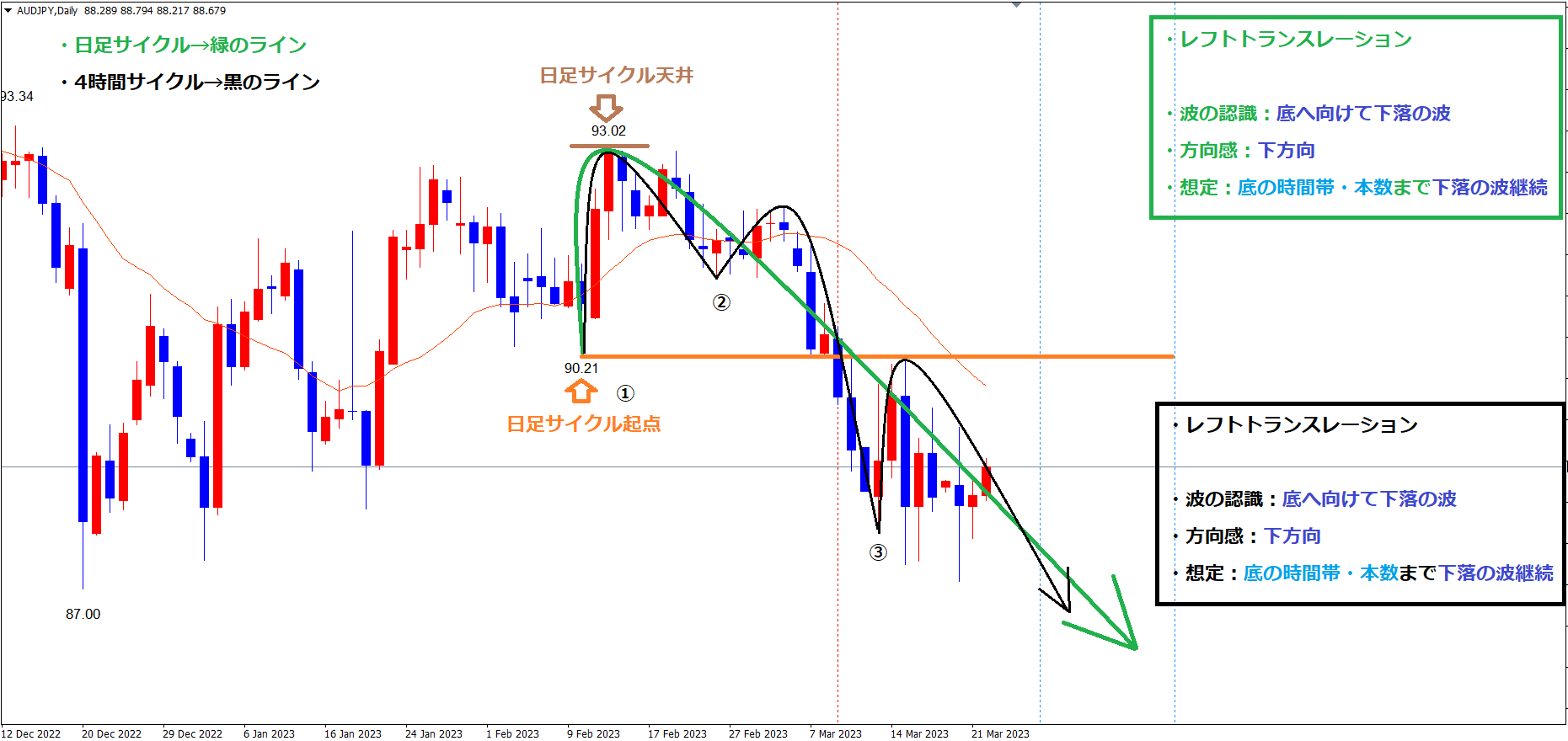 現在は既に起点のオレンジのラインを割れている事で、レフトトランスレーションのサイクルという事が確定しており、