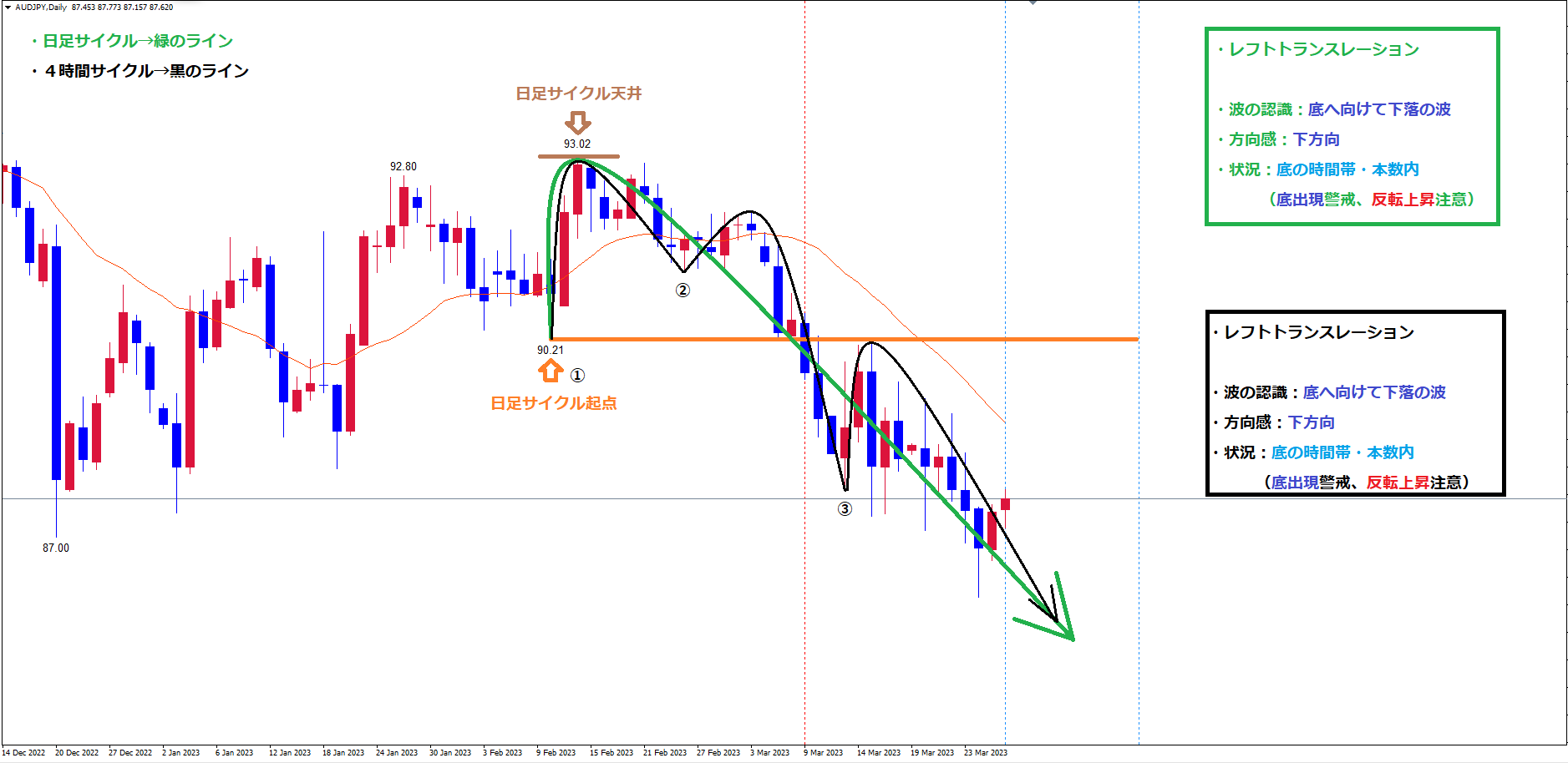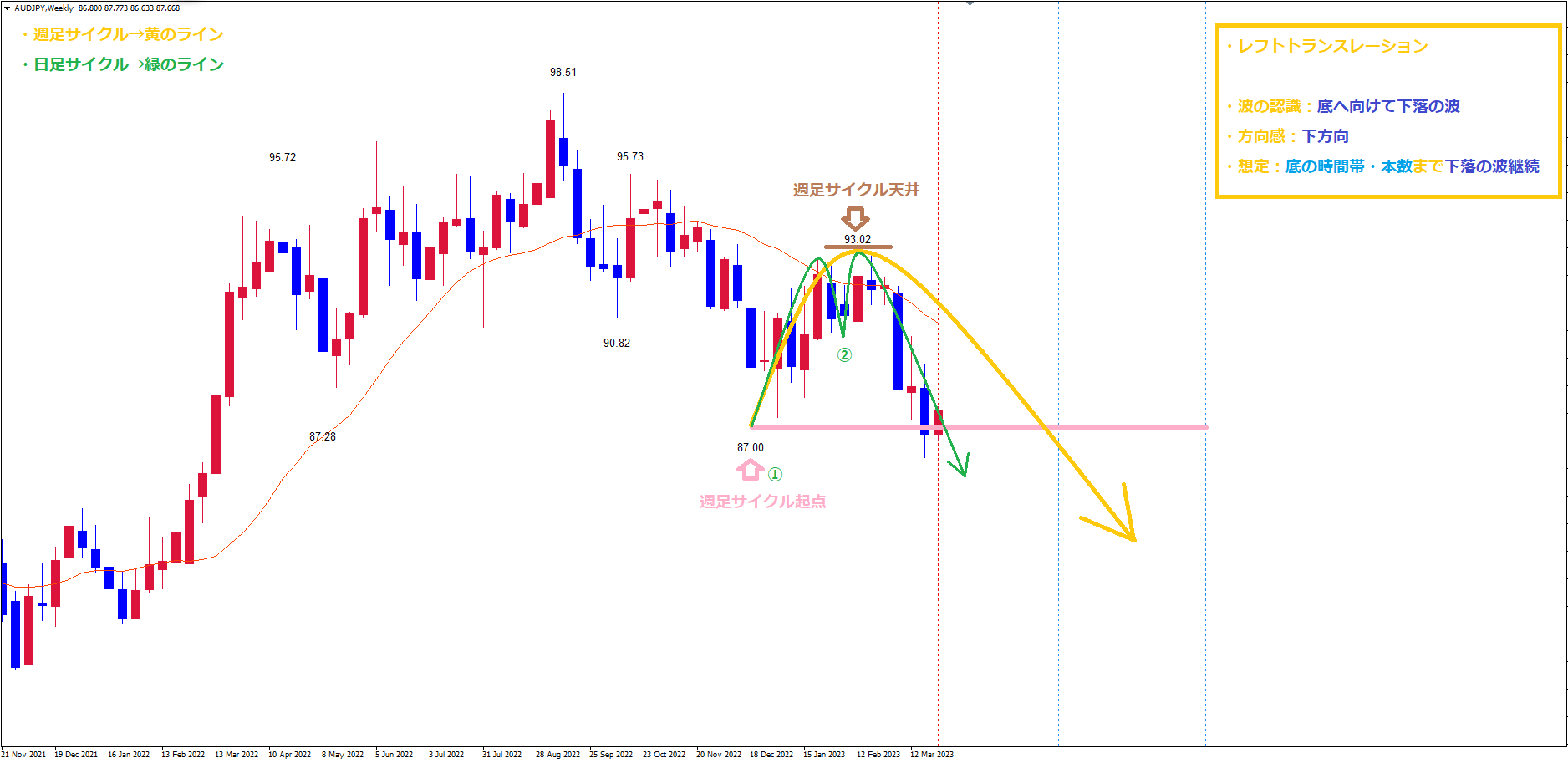 現在は既に起点のオレンジのラインを割れている事で、レフトトランスレーションのサイクルという事が確定しており、
