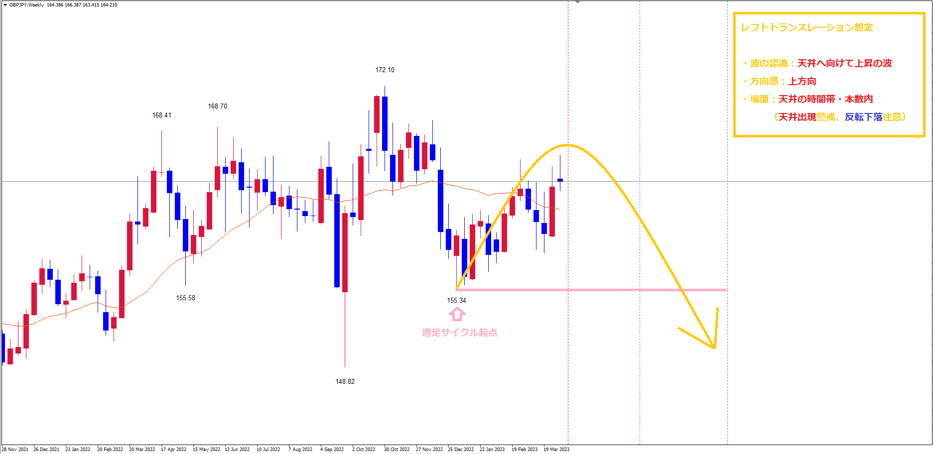 起点の桃のラインからの週足サイクルは、レフトトランスレーションのサイクルを想定しています。