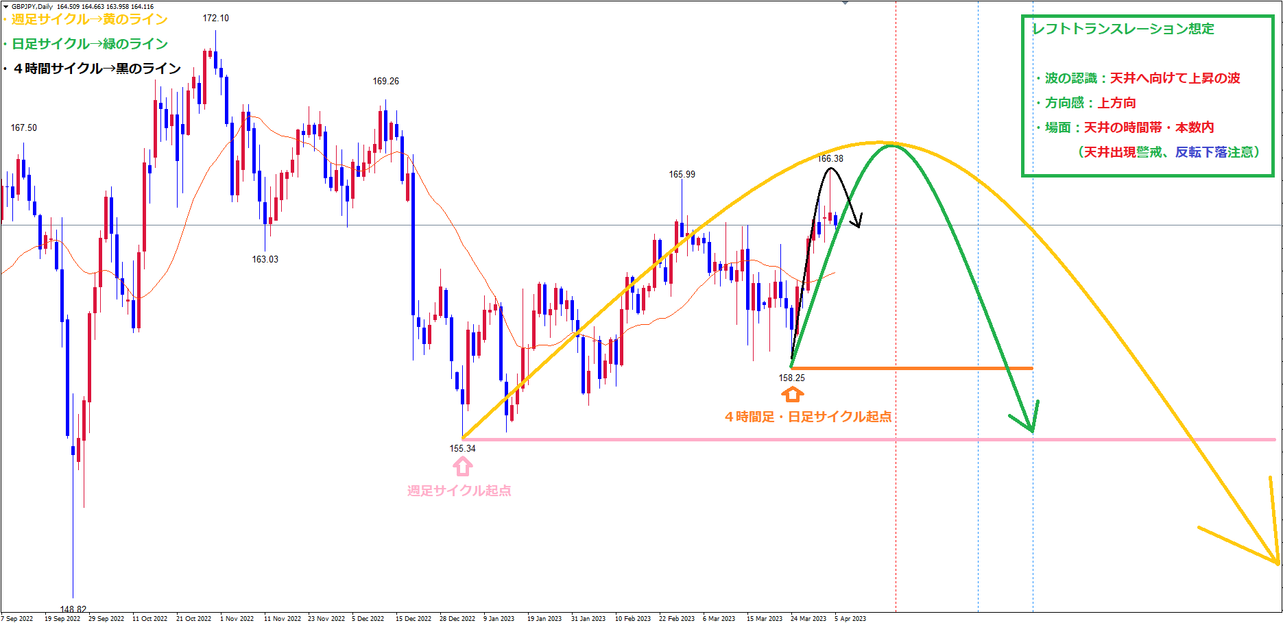 起点のオレンジのラインからの日足サイクルは、レフトトランスレーションのサイクルを想定しています。