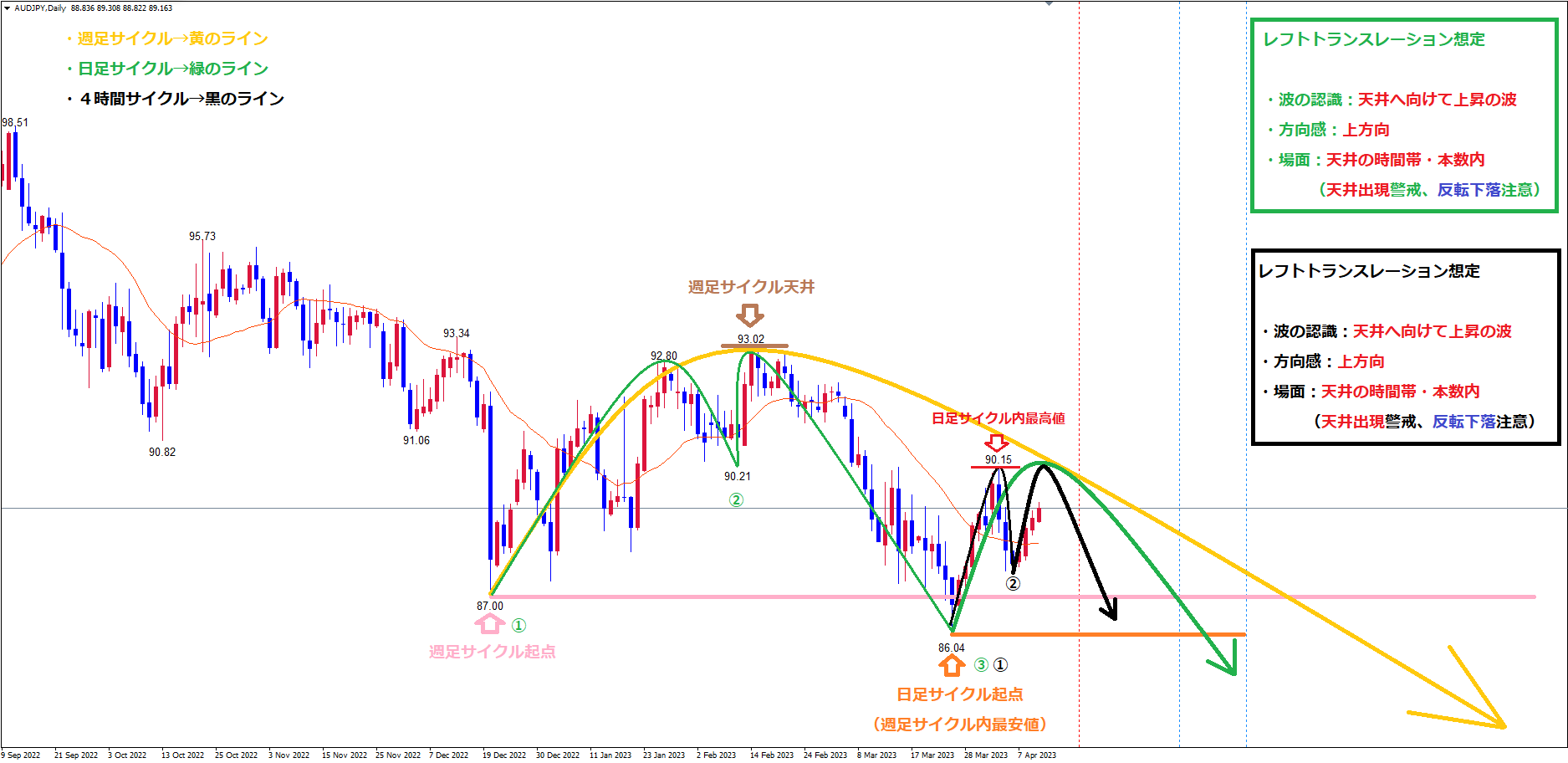 起点オレンジのラインからの日足サイクルは、レフトトランスレーションのサイクルを想定しています。